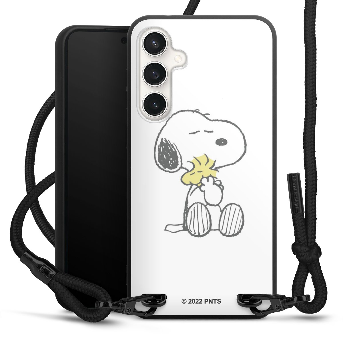 The matt black silicone case is made of flexible TPU (thermoplastic polyurethane) and offers robust protection. The durable, unbreakable material makes the cover flexible and dimensionally stable at the same time. The matte surface makes your design stand out more and is less susceptible to fingerprints and dirt. The stylish trend accessory fits comfortably in the hand and is perfectly complemented by the fabric (polyester) mobile phone strap. The braided fabric strap is approx. 1.70 metres long with a diameter of approx. 0.5 cm. Due to the special knotting technique, the length of the strap can be adjusted by simply pulling it, so that you can adapt it individually to your wishes. The practical case to wear around your neck is available with the fabric strap in black. As a little icing on the cake, we have provided the strap with a chic metal fastener in matt black. The strap is securely fastened to the case with loops made of high-quality genuine leather and press studs. The ends of the fabric strap are covered with metallic end caps and thus protected from fraying.