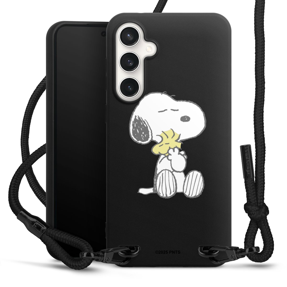 The matt black silicone case is made of flexible TPU (thermoplastic polyurethane) and offers robust protection. The durable, unbreakable material makes the cover flexible and dimensionally stable at the same time. The matte surface makes your design stand out more and is less susceptible to fingerprints and dirt. The stylish trend accessory fits comfortably in the hand and is perfectly complemented by the fabric (polyester) mobile phone strap. The braided fabric strap is approx. 1.70 metres long with a diameter of approx. 0.5 cm. Due to the special knotting technique, the length of the strap can be adjusted by simply pulling it, so that you can adapt it individually to your wishes. The practical case to wear around your neck is available with the fabric strap in black. As a little icing on the cake, we have provided the strap with a chic metal fastener in matt black. The strap is securely fastened to the case with loops made of high-quality genuine leather and press studs. The ends of the fabric strap are covered with metallic end caps and thus protected from fraying.