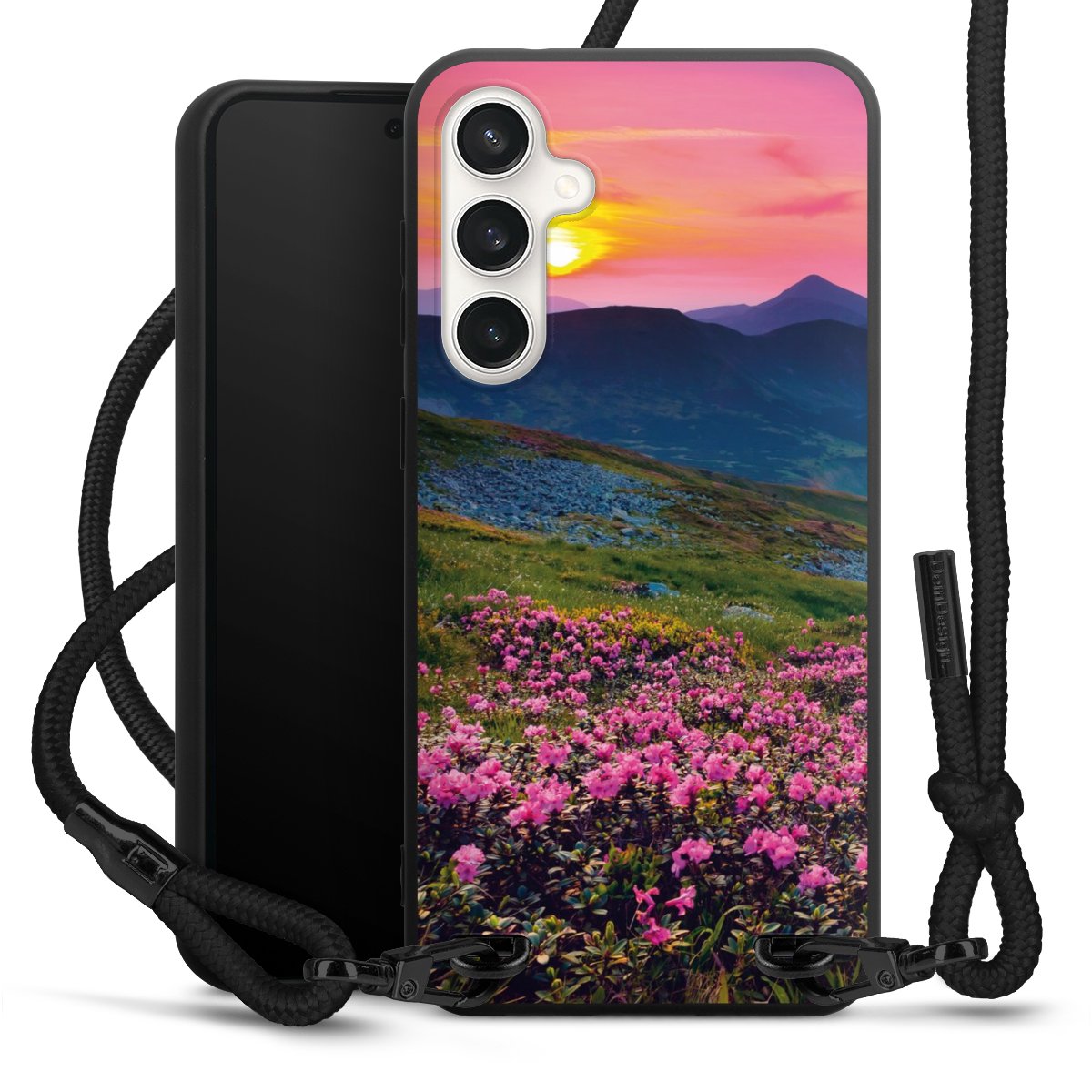 The matt black silicone case is made of flexible TPU (thermoplastic polyurethane) and offers robust protection. The durable, unbreakable material makes the cover flexible and dimensionally stable at the same time. The matte surface makes your design stand out more and is less susceptible to fingerprints and dirt. The stylish trend accessory fits comfortably in the hand and is perfectly complemented by the fabric (polyester) mobile phone strap. The braided fabric strap is approx. 1.70 metres long with a diameter of approx. 0.5 cm. Due to the special knotting technique, the length of the strap can be adjusted by simply pulling it, so that you can adapt it individually to your wishes. The practical case to wear around your neck is available with the fabric strap in black. As a little icing on the cake, we have provided the strap with a chic metal fastener in matt black. The strap is securely fastened to the case with loops made of high-quality genuine leather and press studs. The ends of the fabric strap are covered with metallic end caps and thus protected from fraying.