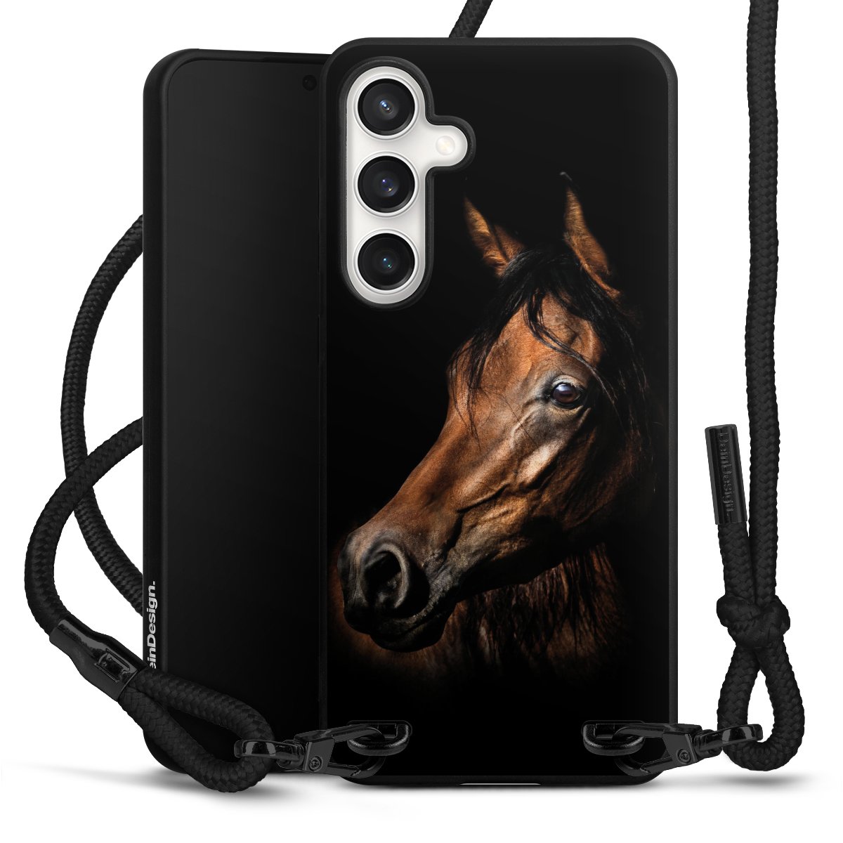 The matt black silicone case is made of flexible TPU (thermoplastic polyurethane) and offers robust protection. The durable, unbreakable material makes the cover flexible and dimensionally stable at the same time. The matte surface makes your design stand out more and is less susceptible to fingerprints and dirt. The stylish trend accessory fits comfortably in the hand and is perfectly complemented by the fabric (polyester) mobile phone strap. The braided fabric strap is approx. 1.70 metres long with a diameter of approx. 0.5 cm. Due to the special knotting technique, the length of the strap can be adjusted by simply pulling it, so that you can adapt it individually to your wishes. The practical case to wear around your neck is available with the fabric strap in black. As a little icing on the cake, we have provided the strap with a chic metal fastener in matt black. The strap is securely fastened to the case with loops made of high-quality genuine leather and press studs. The ends of the fabric strap are covered with metallic end caps and thus protected from fraying.