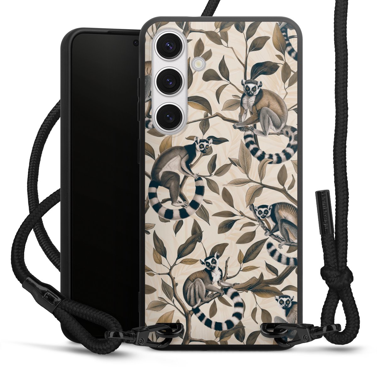 The matt black silicone case is made of flexible TPU (thermoplastic polyurethane) and offers robust protection. The durable, unbreakable material makes the cover flexible and dimensionally stable at the same time. The matte surface makes your design stand out more and is less susceptible to fingerprints and dirt. The stylish trend accessory fits comfortably in the hand and is perfectly complemented by the fabric (polyester) mobile phone strap. The braided fabric strap is approx. 1.70 metres long with a diameter of approx. 0.5 cm. Due to the special knotting technique, the length of the strap can be adjusted by simply pulling it, so that you can adapt it individually to your wishes. The practical case to wear around your neck is available with the fabric strap in black. As a little icing on the cake, we have provided the strap with a chic metal fastener in matt black. The strap is securely fastened to the case with loops made of high-quality genuine leather and press studs. The ends of the fabric strap are covered with metallic end caps and thus protected from fraying.