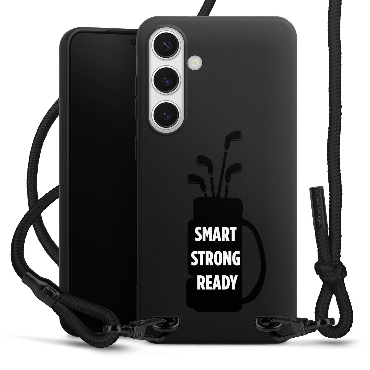 The matt black silicone case is made of flexible TPU (thermoplastic polyurethane) and offers robust protection. The durable, unbreakable material makes the cover flexible and dimensionally stable at the same time. The matte surface makes your design stand out more and is less susceptible to fingerprints and dirt. The stylish trend accessory fits comfortably in the hand and is perfectly complemented by the fabric (polyester) mobile phone strap. The braided fabric strap is approx. 1.70 metres long with a diameter of approx. 0.5 cm. Due to the special knotting technique, the length of the strap can be adjusted by simply pulling it, so that you can adapt it individually to your wishes. The practical case to wear around your neck is available with the fabric strap in black. As a little icing on the cake, we have provided the strap with a chic metal fastener in matt black. The strap is securely fastened to the case with loops made of high-quality genuine leather and press studs. The ends of the fabric strap are covered with metallic end caps and thus protected from fraying.