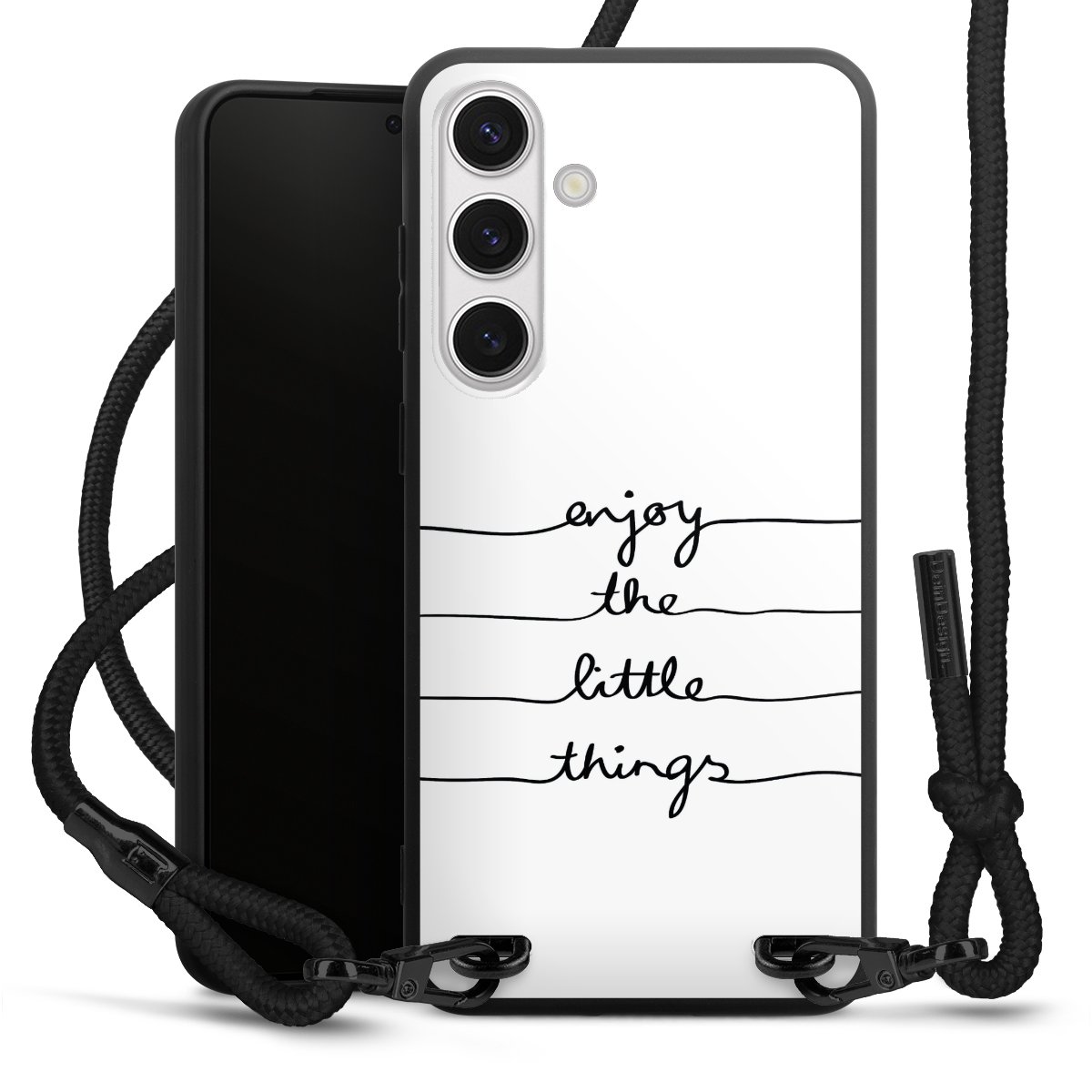 The matt black silicone case is made of flexible TPU (thermoplastic polyurethane) and offers robust protection. The durable, unbreakable material makes the cover flexible and dimensionally stable at the same time. The matte surface makes your design stand out more and is less susceptible to fingerprints and dirt. The stylish trend accessory fits comfortably in the hand and is perfectly complemented by the fabric (polyester) mobile phone strap. The braided fabric strap is approx. 1.70 metres long with a diameter of approx. 0.5 cm. Due to the special knotting technique, the length of the strap can be adjusted by simply pulling it, so that you can adapt it individually to your wishes. The practical case to wear around your neck is available with the fabric strap in black. As a little icing on the cake, we have provided the strap with a chic metal fastener in matt black. The strap is securely fastened to the case with loops made of high-quality genuine leather and press studs. The ends of the fabric strap are covered with metallic end caps and thus protected from fraying.