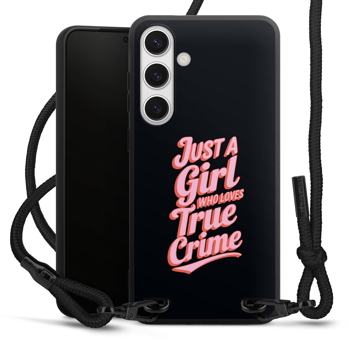 The matt black silicone case is made of flexible TPU (thermoplastic polyurethane) and offers robust protection. The durable, unbreakable material makes the cover flexible and dimensionally stable at the same time. The matte surface makes your design stand out more and is less susceptible to fingerprints and dirt. The stylish trend accessory fits comfortably in the hand and is perfectly complemented by the fabric (polyester) mobile phone strap. The braided fabric strap is approx. 1.70 metres long with a diameter of approx. 0.5 cm. Due to the special knotting technique, the length of the strap can be adjusted by simply pulling it, so that you can adapt it individually to your wishes. The practical case to wear around your neck is available with the fabric strap in black. As a little icing on the cake, we have provided the strap with a chic metal fastener in matt black. The strap is securely fastened to the case with loops made of high-quality genuine leather and press studs. The ends of the fabric strap are covered with metallic end caps and thus protected from fraying.