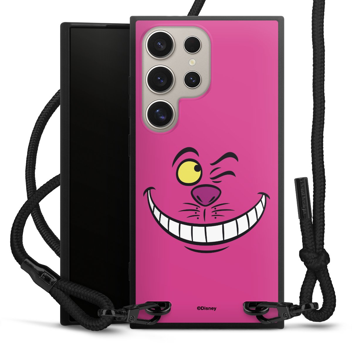 The matt black silicone case is made of flexible TPU (thermoplastic polyurethane) and offers robust protection. The durable, unbreakable material makes the cover flexible and dimensionally stable at the same time. The matte surface makes your design stand out more and is less susceptible to fingerprints and dirt. The stylish trend accessory fits comfortably in the hand and is perfectly complemented by the fabric (polyester) mobile phone strap. The braided fabric strap is approx. 1.70 metres long with a diameter of approx. 0.5 cm. Due to the special knotting technique, the length of the strap can be adjusted by simply pulling it, so that you can adapt it individually to your wishes. The practical case to wear around your neck is available with the fabric strap in black. As a little icing on the cake, we have provided the strap with a chic metal fastener in matt black. The strap is securely fastened to the case with loops made of high-quality genuine leather and press studs. The ends of the fabric strap are covered with metallic end caps and thus protected from fraying.