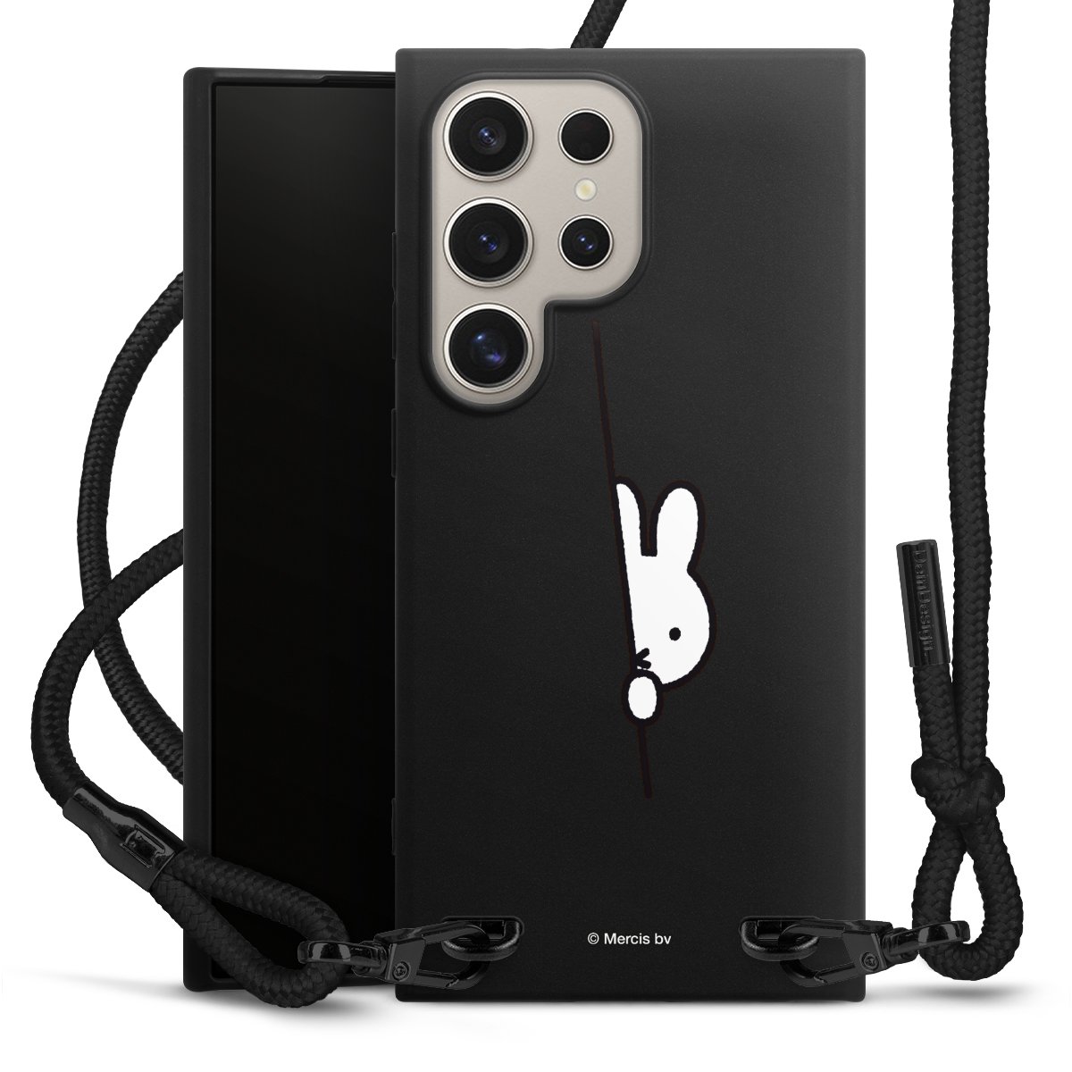 The matt black silicone case is made of flexible TPU (thermoplastic polyurethane) and offers robust protection. The durable, unbreakable material makes the cover flexible and dimensionally stable at the same time. The matte surface makes your design stand out more and is less susceptible to fingerprints and dirt. The stylish trend accessory fits comfortably in the hand and is perfectly complemented by the fabric (polyester) mobile phone strap. The braided fabric strap is approx. 1.70 metres long with a diameter of approx. 0.5 cm. Due to the special knotting technique, the length of the strap can be adjusted by simply pulling it, so that you can adapt it individually to your wishes. The practical case to wear around your neck is available with the fabric strap in black. As a little icing on the cake, we have provided the strap with a chic metal fastener in matt black. The strap is securely fastened to the case with loops made of high-quality genuine leather and press studs. The ends of the fabric strap are covered with metallic end caps and thus protected from fraying.
