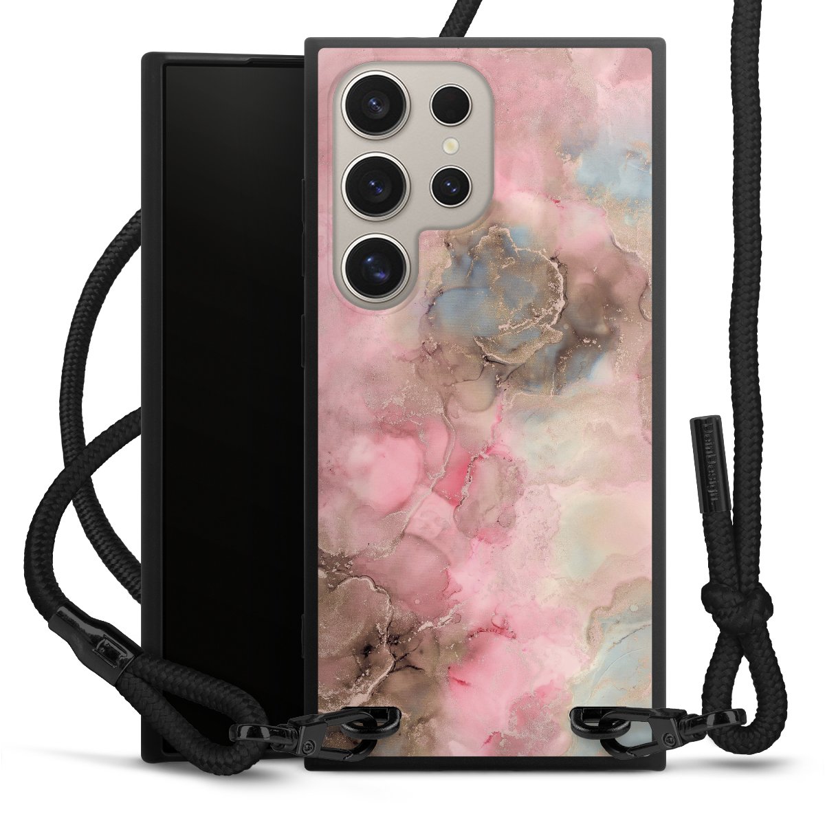 The matt black silicone case is made of flexible TPU (thermoplastic polyurethane) and offers robust protection. The durable, unbreakable material makes the cover flexible and dimensionally stable at the same time. The matte surface makes your design stand out more and is less susceptible to fingerprints and dirt. The stylish trend accessory fits comfortably in the hand and is perfectly complemented by the fabric (polyester) mobile phone strap. The braided fabric strap is approx. 1.70 metres long with a diameter of approx. 0.5 cm. Due to the special knotting technique, the length of the strap can be adjusted by simply pulling it, so that you can adapt it individually to your wishes. The practical case to wear around your neck is available with the fabric strap in black. As a little icing on the cake, we have provided the strap with a chic metal fastener in matt black. The strap is securely fastened to the case with loops made of high-quality genuine leather and press studs. The ends of the fabric strap are covered with metallic end caps and thus protected from fraying.
