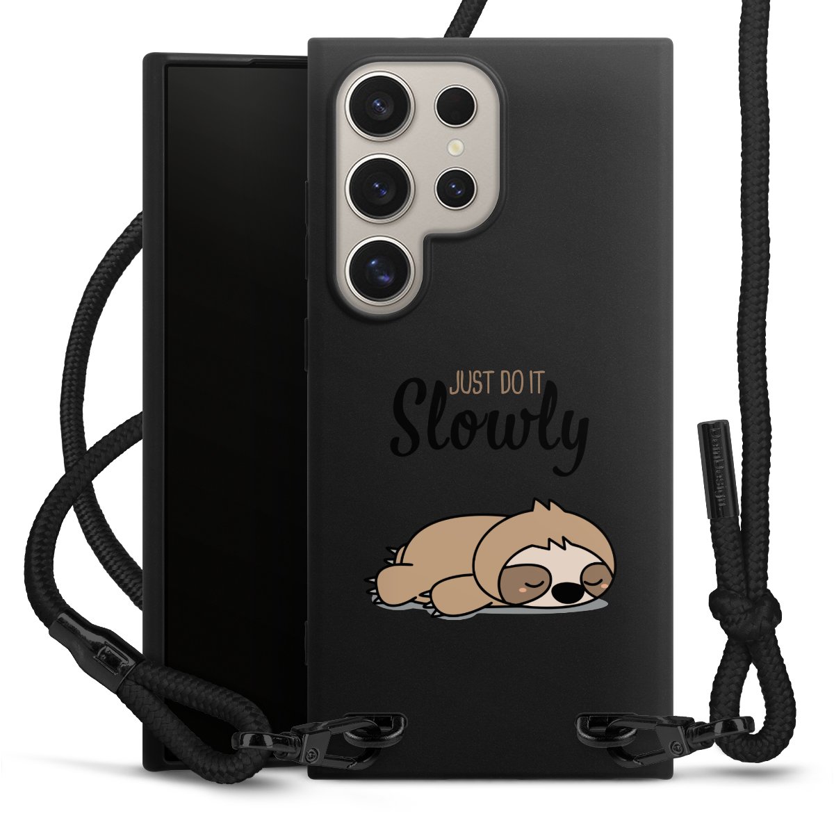 The matt black silicone case is made of flexible TPU (thermoplastic polyurethane) and offers robust protection. The durable, unbreakable material makes the cover flexible and dimensionally stable at the same time. The matte surface makes your design stand out more and is less susceptible to fingerprints and dirt. The stylish trend accessory fits comfortably in the hand and is perfectly complemented by the fabric (polyester) mobile phone strap. The braided fabric strap is approx. 1.70 metres long with a diameter of approx. 0.5 cm. Due to the special knotting technique, the length of the strap can be adjusted by simply pulling it, so that you can adapt it individually to your wishes. The practical case to wear around your neck is available with the fabric strap in black. As a little icing on the cake, we have provided the strap with a chic metal fastener in matt black. The strap is securely fastened to the case with loops made of high-quality genuine leather and press studs. The ends of the fabric strap are covered with metallic end caps and thus protected from fraying.