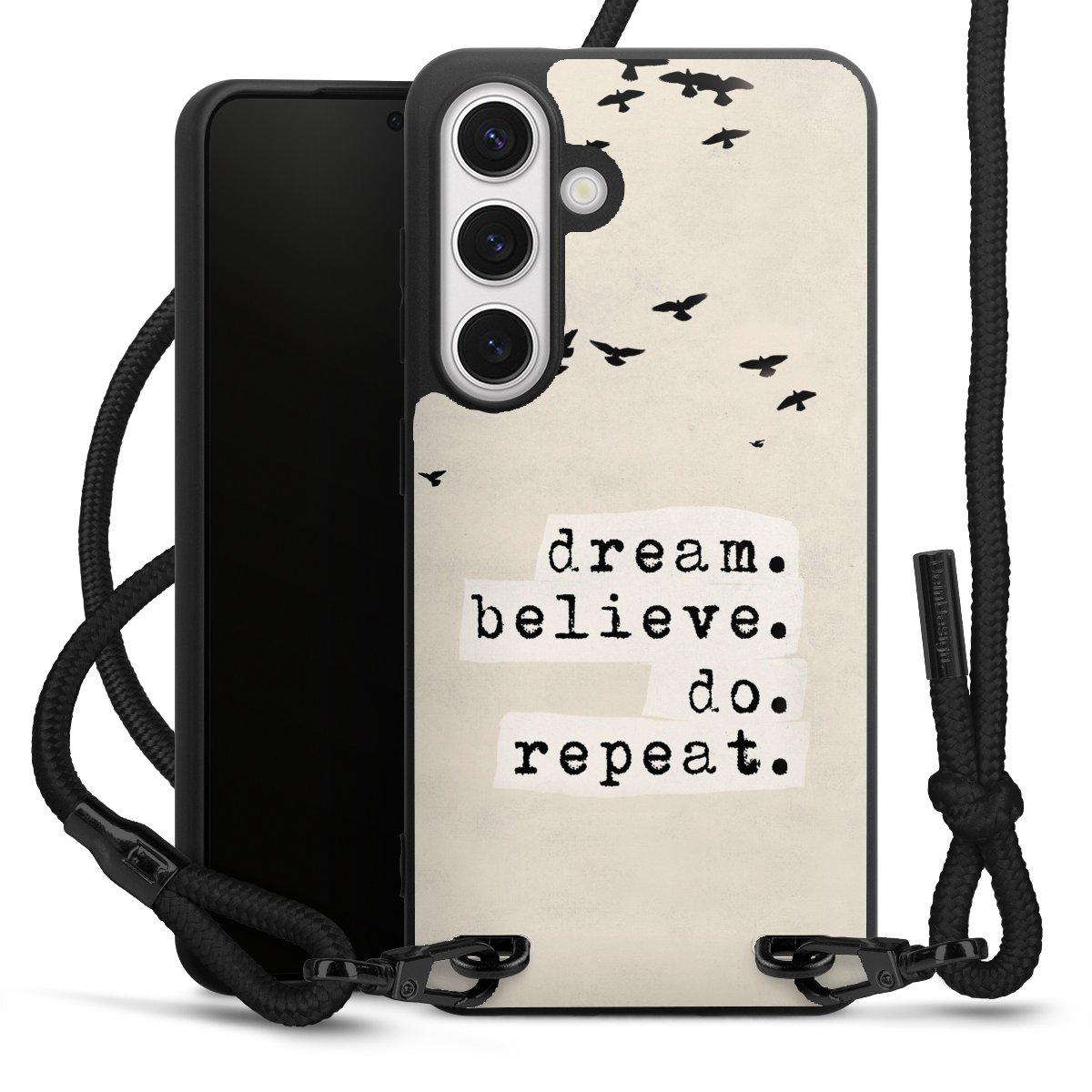 We use the solid direct print process for this phone case, which is why the print area only covers the back and the edge remains unprinted. The case to wear around your neck can be ordered unprinted, fully printed, or partially printed. For your design, either choose one of our exclusive shop motifs or get creative and create your own design, for example with photos and overlays. Design your own personal trend accessory and make an individual statement on the streets!