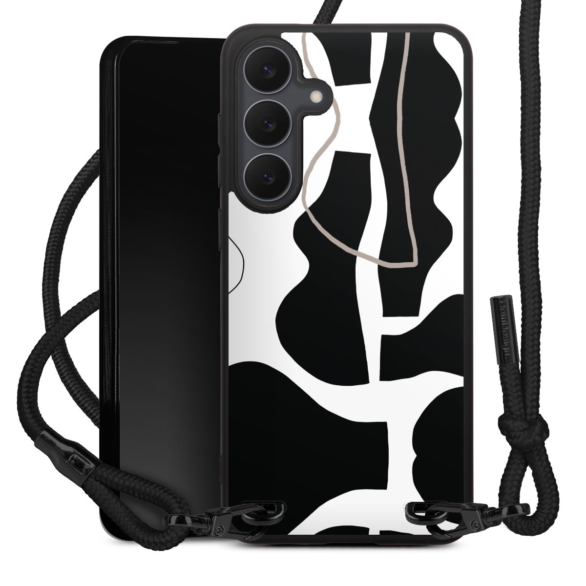 The matt black silicone case is made of flexible TPU (thermoplastic polyurethane) and offers robust protection. The durable, unbreakable material makes the cover flexible and dimensionally stable at the same time. The matte surface makes your design stand out more and is less susceptible to fingerprints and dirt. The stylish trend accessory fits comfortably in the hand and is perfectly complemented by the fabric (polyester) mobile phone strap. The braided fabric strap is approx. 1.70 metres long with a diameter of approx. 0.5 cm. Due to the special knotting technique, the length of the strap can be adjusted by simply pulling it, so that you can adapt it individually to your wishes. The practical case to wear around your neck is available with the fabric strap in black. As a little icing on the cake, we have provided the strap with a chic metal fastener in matt black. The strap is securely fastened to the case with loops made of high-quality genuine leather and press studs. The ends of the fabric strap are covered with metallic end caps and thus protected from fraying.