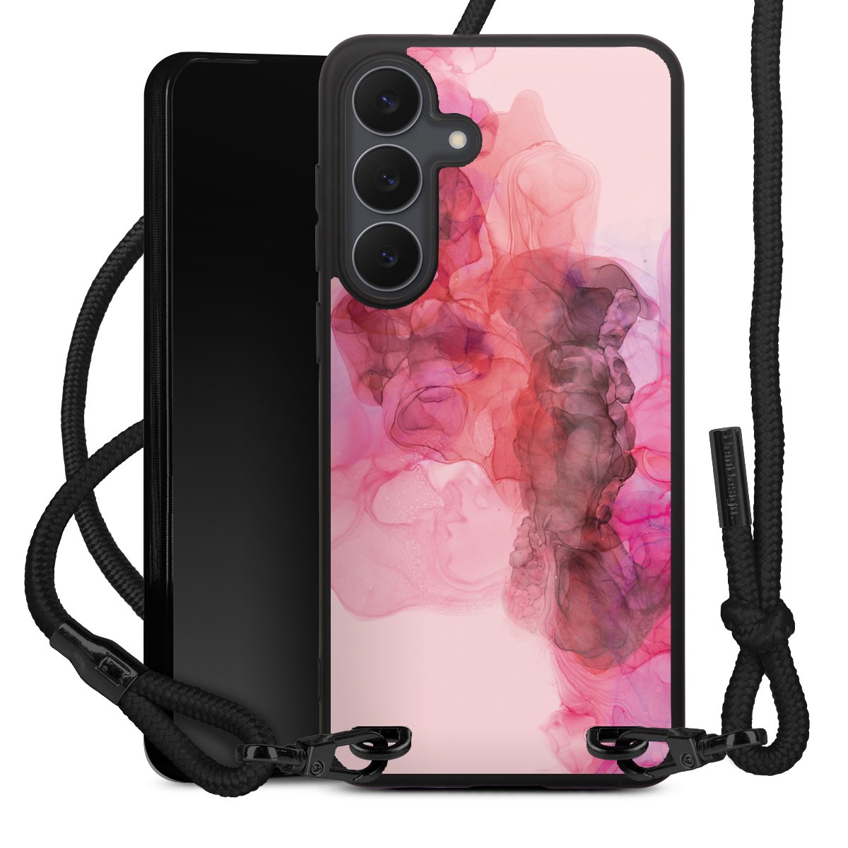 The matt black silicone case is made of flexible TPU (thermoplastic polyurethane) and offers robust protection. The durable, unbreakable material makes the cover flexible and dimensionally stable at the same time. The matte surface makes your design stand out more and is less susceptible to fingerprints and dirt. The stylish trend accessory fits comfortably in the hand and is perfectly complemented by the fabric (polyester) mobile phone strap. The braided fabric strap is approx. 1.70 metres long with a diameter of approx. 0.5 cm. Due to the special knotting technique, the length of the strap can be adjusted by simply pulling it, so that you can adapt it individually to your wishes. The practical case to wear around your neck is available with the fabric strap in black. As a little icing on the cake, we have provided the strap with a chic metal fastener in matt black. The strap is securely fastened to the case with loops made of high-quality genuine leather and press studs. The ends of the fabric strap are covered with metallic end caps and thus protected from fraying.