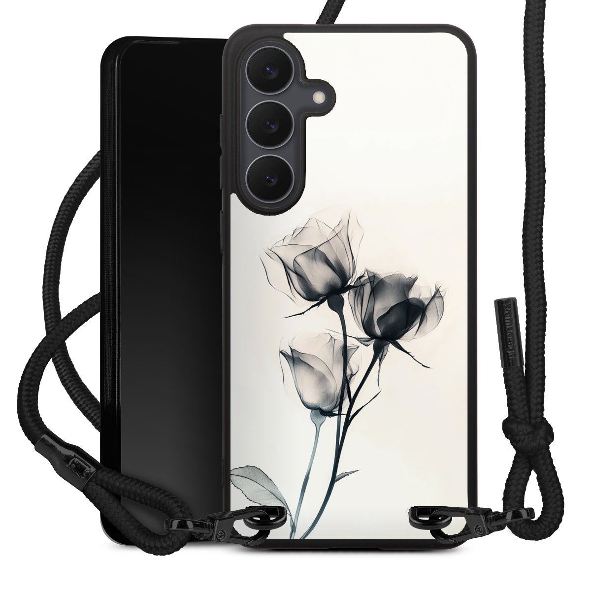 The matt black silicone case is made of flexible TPU (thermoplastic polyurethane) and offers robust protection. The durable, unbreakable material makes the cover flexible and dimensionally stable at the same time. The matte surface makes your design stand out more and is less susceptible to fingerprints and dirt. The stylish trend accessory fits comfortably in the hand and is perfectly complemented by the fabric (polyester) mobile phone strap. The braided fabric strap is approx. 1.70 metres long with a diameter of approx. 0.5 cm. Due to the special knotting technique, the length of the strap can be adjusted by simply pulling it, so that you can adapt it individually to your wishes. The practical case to wear around your neck is available with the fabric strap in black. As a little icing on the cake, we have provided the strap with a chic metal fastener in matt black. The strap is securely fastened to the case with loops made of high-quality genuine leather and press studs. The ends of the fabric strap are covered with metallic end caps and thus protected from fraying.