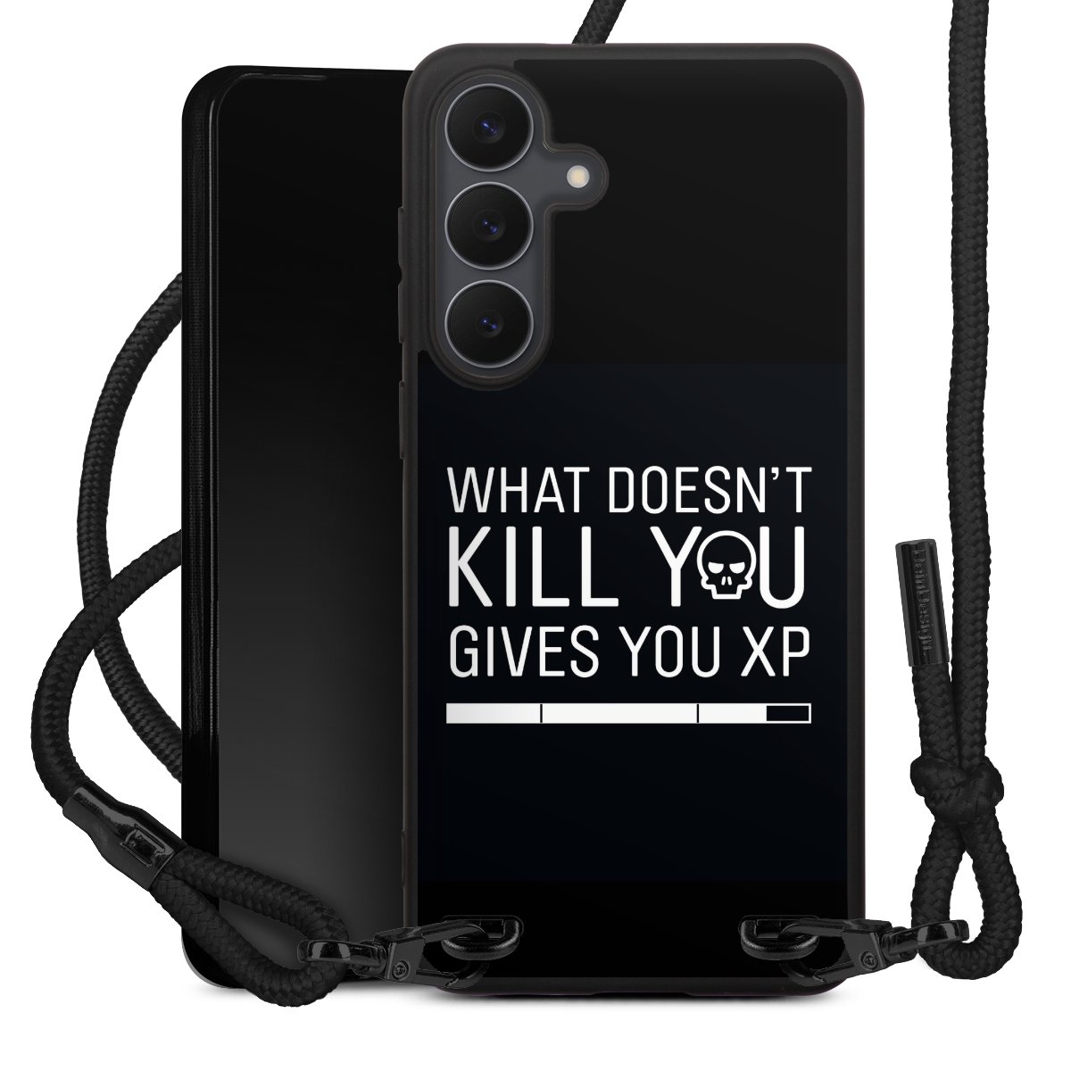 The matt black silicone case is made of flexible TPU (thermoplastic polyurethane) and offers robust protection. The durable, unbreakable material makes the cover flexible and dimensionally stable at the same time. The matte surface makes your design stand out more and is less susceptible to fingerprints and dirt. The stylish trend accessory fits comfortably in the hand and is perfectly complemented by the fabric (polyester) mobile phone strap. The braided fabric strap is approx. 1.70 metres long with a diameter of approx. 0.5 cm. Due to the special knotting technique, the length of the strap can be adjusted by simply pulling it, so that you can adapt it individually to your wishes. The practical case to wear around your neck is available with the fabric strap in black. As a little icing on the cake, we have provided the strap with a chic metal fastener in matt black. The strap is securely fastened to the case with loops made of high-quality genuine leather and press studs. The ends of the fabric strap are covered with metallic end caps and thus protected from fraying.