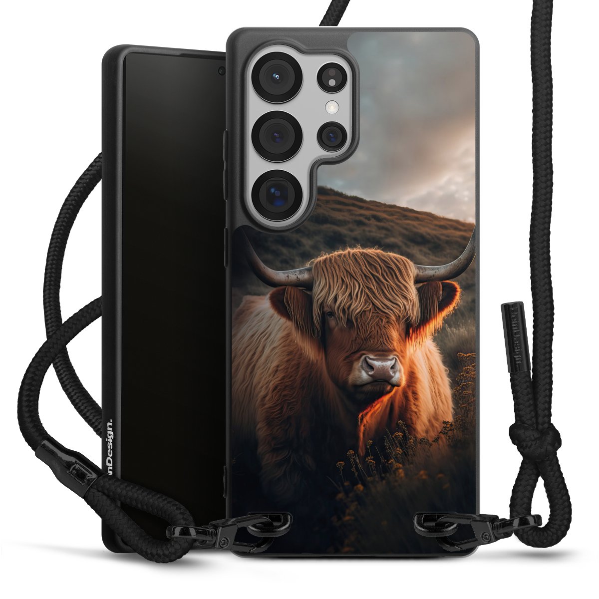 The matt black silicone case is made of flexible TPU (thermoplastic polyurethane) and offers robust protection. The durable, unbreakable material makes the cover flexible and dimensionally stable at the same time. The matte surface makes your design stand out more and is less susceptible to fingerprints and dirt. The stylish trend accessory fits comfortably in the hand and is perfectly complemented by the fabric (polyester) mobile phone strap. The braided fabric strap is approx. 1.70 metres long with a diameter of approx. 0.5 cm. Due to the special knotting technique, the length of the strap can be adjusted by simply pulling it, so that you can adapt it individually to your wishes. The practical case to wear around your neck is available with the fabric strap in black. As a little icing on the cake, we have provided the strap with a chic metal fastener in matt black. The strap is securely fastened to the case with loops made of high-quality genuine leather and press studs. The ends of the fabric strap are covered with metallic end caps and thus protected from fraying.