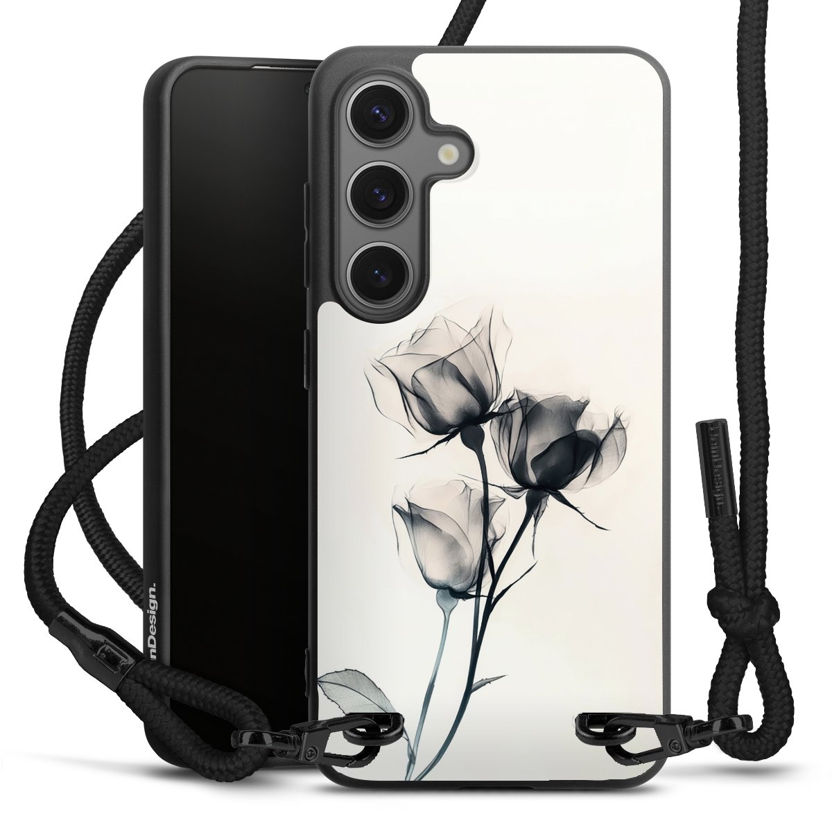 The matt black silicone case is made of flexible TPU (thermoplastic polyurethane) and offers robust protection. The durable, unbreakable material makes the cover flexible and dimensionally stable at the same time. The matte surface makes your design stand out more and is less susceptible to fingerprints and dirt. The stylish trend accessory fits comfortably in the hand and is perfectly complemented by the fabric (polyester) mobile phone strap. The braided fabric strap is approx. 1.70 metres long with a diameter of approx. 0.5 cm. Due to the special knotting technique, the length of the strap can be adjusted by simply pulling it, so that you can adapt it individually to your wishes. The practical case to wear around your neck is available with the fabric strap in black. As a little icing on the cake, we have provided the strap with a chic metal fastener in matt black. The strap is securely fastened to the case with loops made of high-quality genuine leather and press studs. The ends of the fabric strap are covered with metallic end caps and thus protected from fraying.