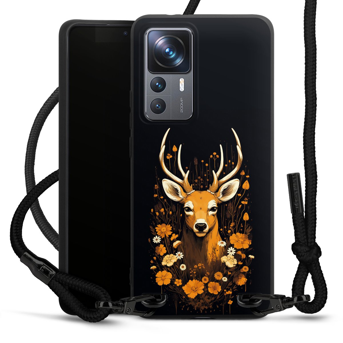 The matt black silicone case is made of flexible TPU (thermoplastic polyurethane) and offers robust protection. The durable, unbreakable material makes the cover flexible and dimensionally stable at the same time. The matte surface makes your design stand out more and is less susceptible to fingerprints and dirt. The stylish trend accessory fits comfortably in the hand and is perfectly complemented by the fabric (polyester) mobile phone strap. The braided fabric strap is approx. 1.70 metres long with a diameter of approx. 0.5 cm. Due to the special knotting technique, the length of the strap can be adjusted by simply pulling it, so that you can adapt it individually to your wishes. The practical case to wear around your neck is available with the fabric strap in black. As a little icing on the cake, we have provided the strap with a chic metal fastener in matt black. The strap is securely fastened to the case with loops made of high-quality genuine leather and press studs. The ends of the fabric strap are covered with metallic end caps and thus protected from fraying.