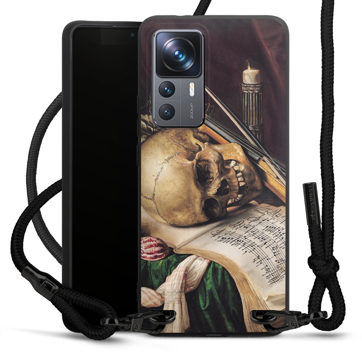 The matt black silicone case is made of flexible TPU (thermoplastic polyurethane) and offers robust protection. The durable, unbreakable material makes the cover flexible and dimensionally stable at the same time. The matte surface makes your design stand out more and is less susceptible to fingerprints and dirt. The stylish trend accessory fits comfortably in the hand and is perfectly complemented by the fabric (polyester) mobile phone strap. The braided fabric strap is approx. 1.70 metres long with a diameter of approx. 0.5 cm. Due to the special knotting technique, the length of the strap can be adjusted by simply pulling it, so that you can adapt it individually to your wishes. The practical case to wear around your neck is available with the fabric strap in black. As a little icing on the cake, we have provided the strap with a chic metal fastener in matt black. The strap is securely fastened to the case with loops made of high-quality genuine leather and press studs. The ends of the fabric strap are covered with metallic end caps and thus protected from fraying.