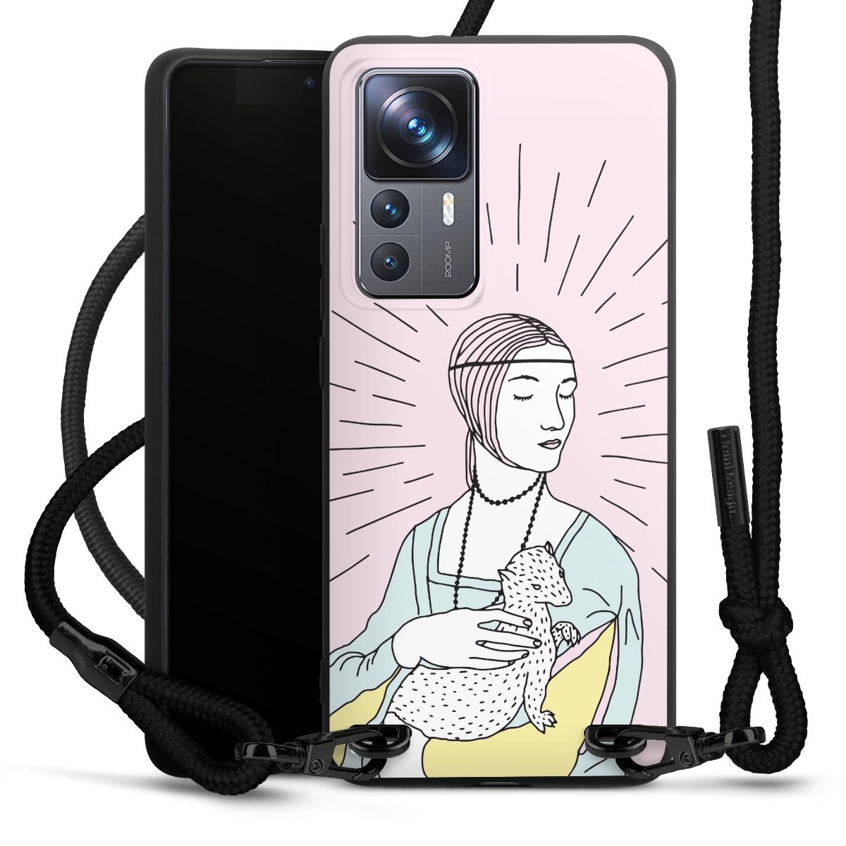 The matt black silicone case is made of flexible TPU (thermoplastic polyurethane) and offers robust protection. The durable, unbreakable material makes the cover flexible and dimensionally stable at the same time. The matte surface makes your design stand out more and is less susceptible to fingerprints and dirt. The stylish trend accessory fits comfortably in the hand and is perfectly complemented by the fabric (polyester) mobile phone strap. The braided fabric strap is approx. 1.70 metres long with a diameter of approx. 0.5 cm. Due to the special knotting technique, the length of the strap can be adjusted by simply pulling it, so that you can adapt it individually to your wishes. The practical case to wear around your neck is available with the fabric strap in black. As a little icing on the cake, we have provided the strap with a chic metal fastener in matt black. The strap is securely fastened to the case with loops made of high-quality genuine leather and press studs. The ends of the fabric strap are covered with metallic end caps and thus protected from fraying.