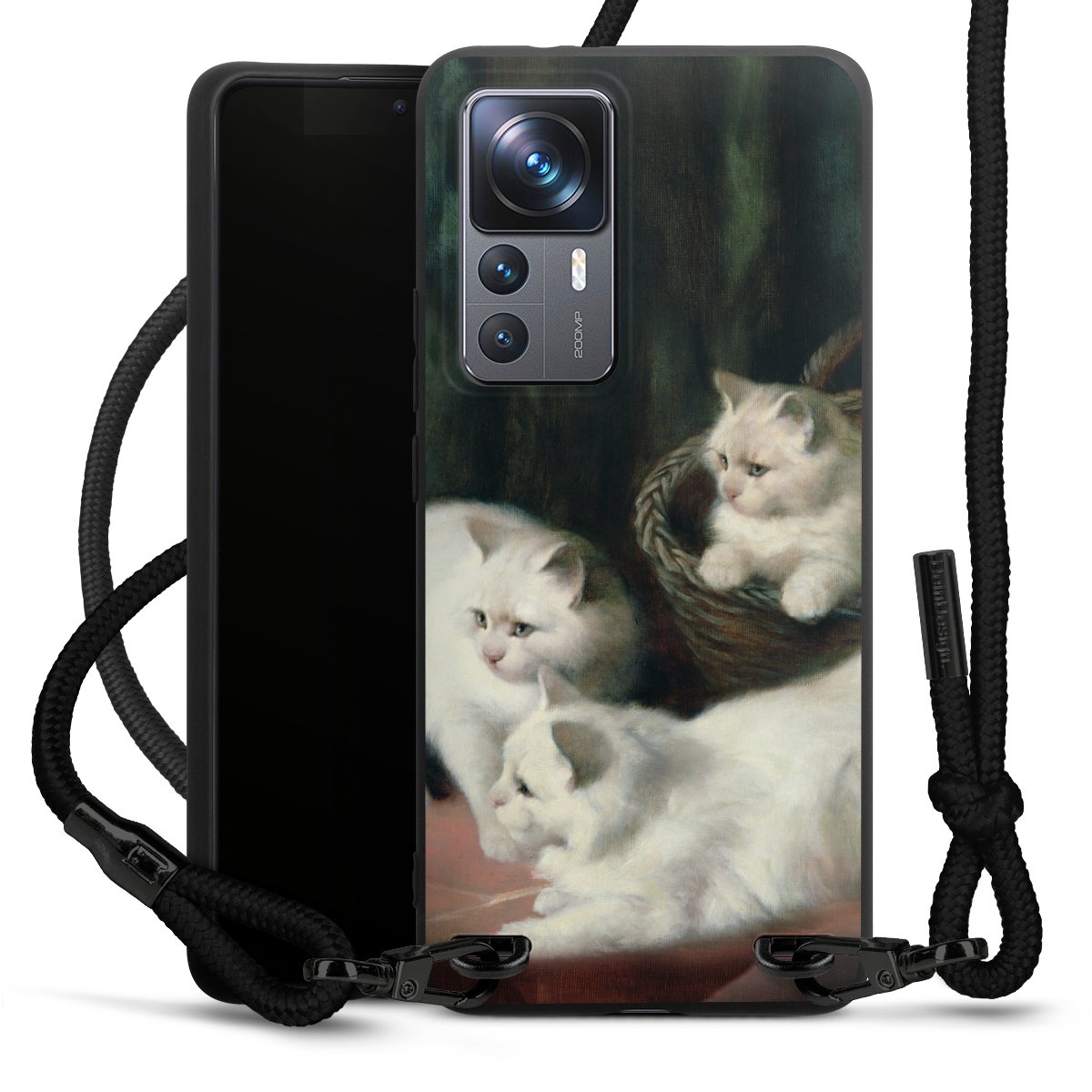 The matt black silicone case is made of flexible TPU (thermoplastic polyurethane) and offers robust protection. The durable, unbreakable material makes the cover flexible and dimensionally stable at the same time. The matte surface makes your design stand out more and is less susceptible to fingerprints and dirt. The stylish trend accessory fits comfortably in the hand and is perfectly complemented by the fabric (polyester) mobile phone strap. The braided fabric strap is approx. 1.70 metres long with a diameter of approx. 0.5 cm. Due to the special knotting technique, the length of the strap can be adjusted by simply pulling it, so that you can adapt it individually to your wishes. The practical case to wear around your neck is available with the fabric strap in black. As a little icing on the cake, we have provided the strap with a chic metal fastener in matt black. The strap is securely fastened to the case with loops made of high-quality genuine leather and press studs. The ends of the fabric strap are covered with metallic end caps and thus protected from fraying.