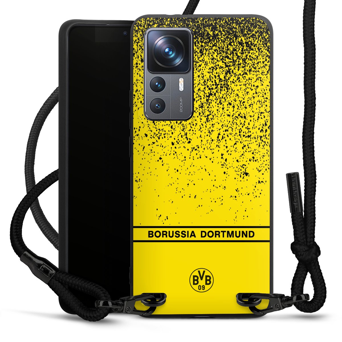 The matt black silicone case is made of flexible TPU (thermoplastic polyurethane) and offers robust protection. The durable, unbreakable material makes the cover flexible and dimensionally stable at the same time. The matte surface makes your design stand out more and is less susceptible to fingerprints and dirt. The stylish trend accessory fits comfortably in the hand and is perfectly complemented by the fabric (polyester) mobile phone strap. The braided fabric strap is approx. 1.70 metres long with a diameter of approx. 0.5 cm. Due to the special knotting technique, the length of the strap can be adjusted by simply pulling it, so that you can adapt it individually to your wishes. The practical case to wear around your neck is available with the fabric strap in black. As a little icing on the cake, we have provided the strap with a chic metal fastener in matt black. The strap is securely fastened to the case with loops made of high-quality genuine leather and press studs. The ends of the fabric strap are covered with metallic end caps and thus protected from fraying.