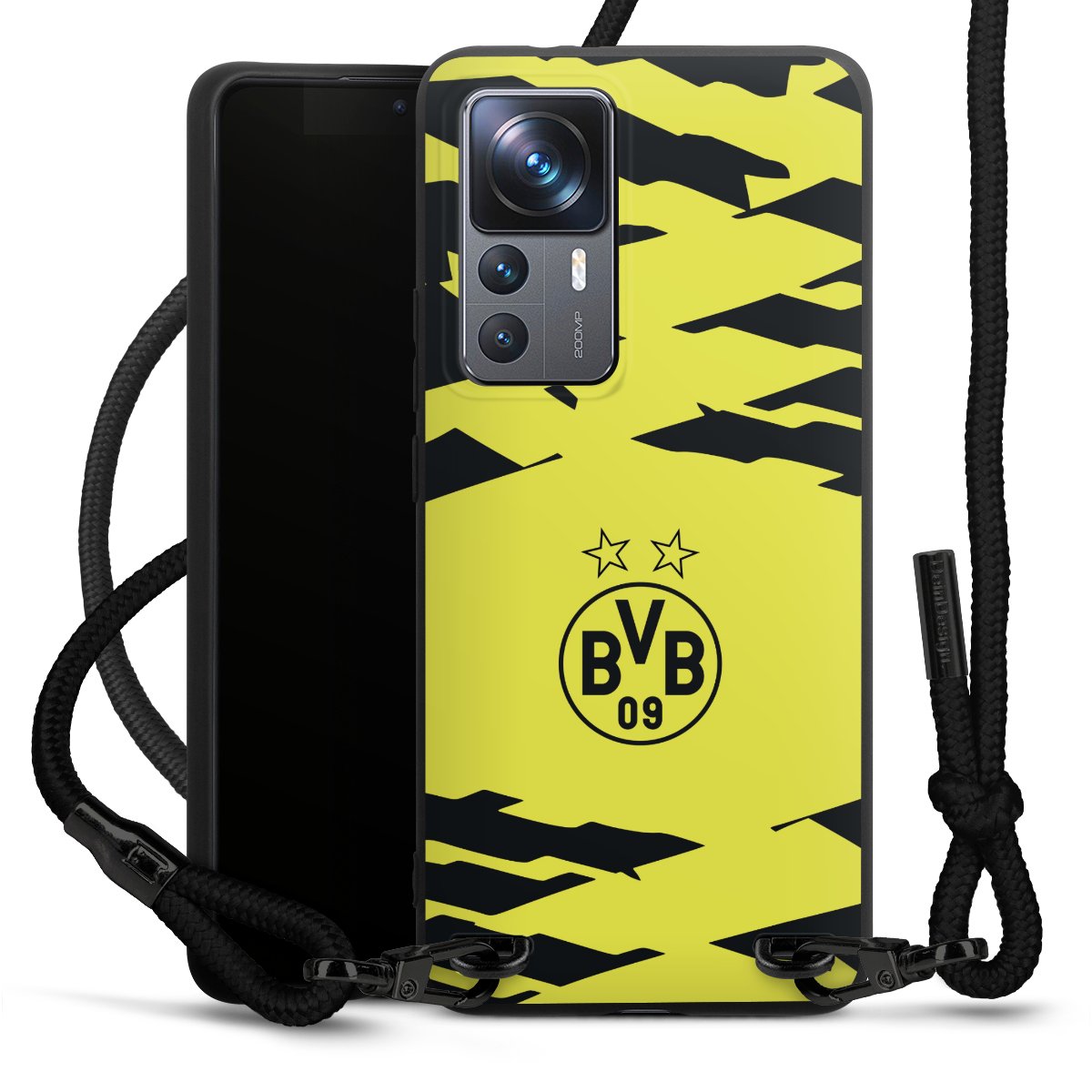 The matt black silicone case is made of flexible TPU (thermoplastic polyurethane) and offers robust protection. The durable, unbreakable material makes the cover flexible and dimensionally stable at the same time. The matte surface makes your design stand out more and is less susceptible to fingerprints and dirt. The stylish trend accessory fits comfortably in the hand and is perfectly complemented by the fabric (polyester) mobile phone strap. The braided fabric strap is approx. 1.70 metres long with a diameter of approx. 0.5 cm. Due to the special knotting technique, the length of the strap can be adjusted by simply pulling it, so that you can adapt it individually to your wishes. The practical case to wear around your neck is available with the fabric strap in black. As a little icing on the cake, we have provided the strap with a chic metal fastener in matt black. The strap is securely fastened to the case with loops made of high-quality genuine leather and press studs. The ends of the fabric strap are covered with metallic end caps and thus protected from fraying.