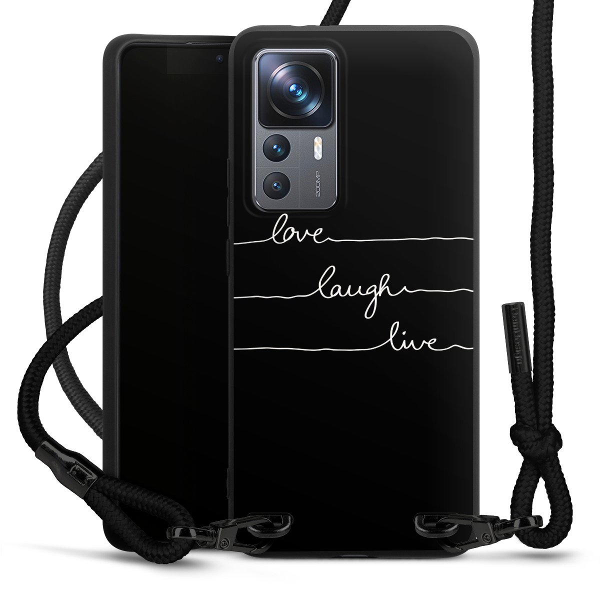 The matt black silicone case is made of flexible TPU (thermoplastic polyurethane) and offers robust protection. The durable, unbreakable material makes the cover flexible and dimensionally stable at the same time. The matte surface makes your design stand out more and is less susceptible to fingerprints and dirt. The stylish trend accessory fits comfortably in the hand and is perfectly complemented by the fabric (polyester) mobile phone strap. The braided fabric strap is approx. 1.70 metres long with a diameter of approx. 0.5 cm. Due to the special knotting technique, the length of the strap can be adjusted by simply pulling it, so that you can adapt it individually to your wishes. The practical case to wear around your neck is available with the fabric strap in black. As a little icing on the cake, we have provided the strap with a chic metal fastener in matt black. The strap is securely fastened to the case with loops made of high-quality genuine leather and press studs. The ends of the fabric strap are covered with metallic end caps and thus protected from fraying.