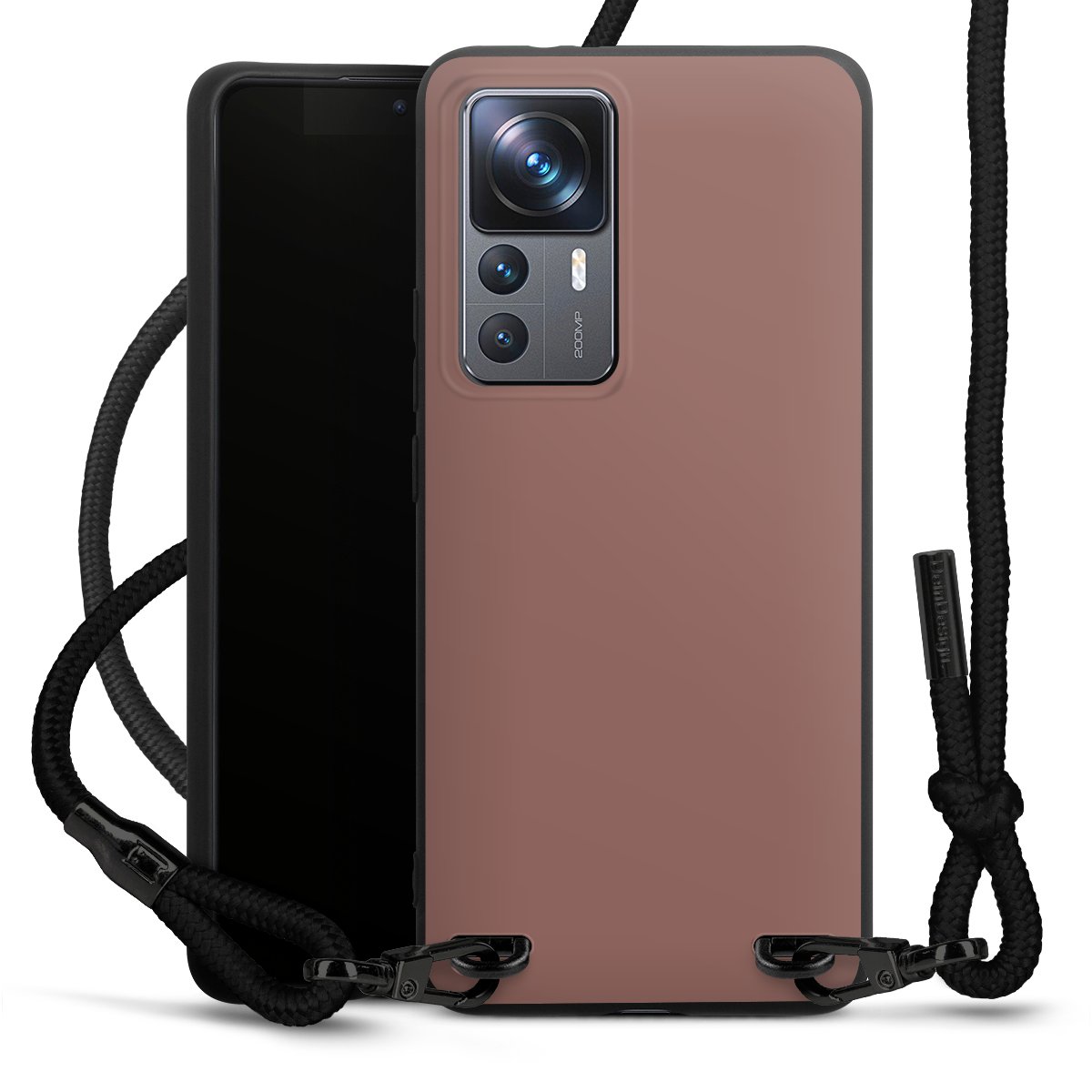 The matt black silicone case is made of flexible TPU (thermoplastic polyurethane) and offers robust protection. The durable, unbreakable material makes the cover flexible and dimensionally stable at the same time. The matte surface makes your design stand out more and is less susceptible to fingerprints and dirt. The stylish trend accessory fits comfortably in the hand and is perfectly complemented by the fabric (polyester) mobile phone strap. The braided fabric strap is approx. 1.70 metres long with a diameter of approx. 0.5 cm. Due to the special knotting technique, the length of the strap can be adjusted by simply pulling it, so that you can adapt it individually to your wishes. The practical case to wear around your neck is available with the fabric strap in black. As a little icing on the cake, we have provided the strap with a chic metal fastener in matt black. The strap is securely fastened to the case with loops made of high-quality genuine leather and press studs. The ends of the fabric strap are covered with metallic end caps and thus protected from fraying.