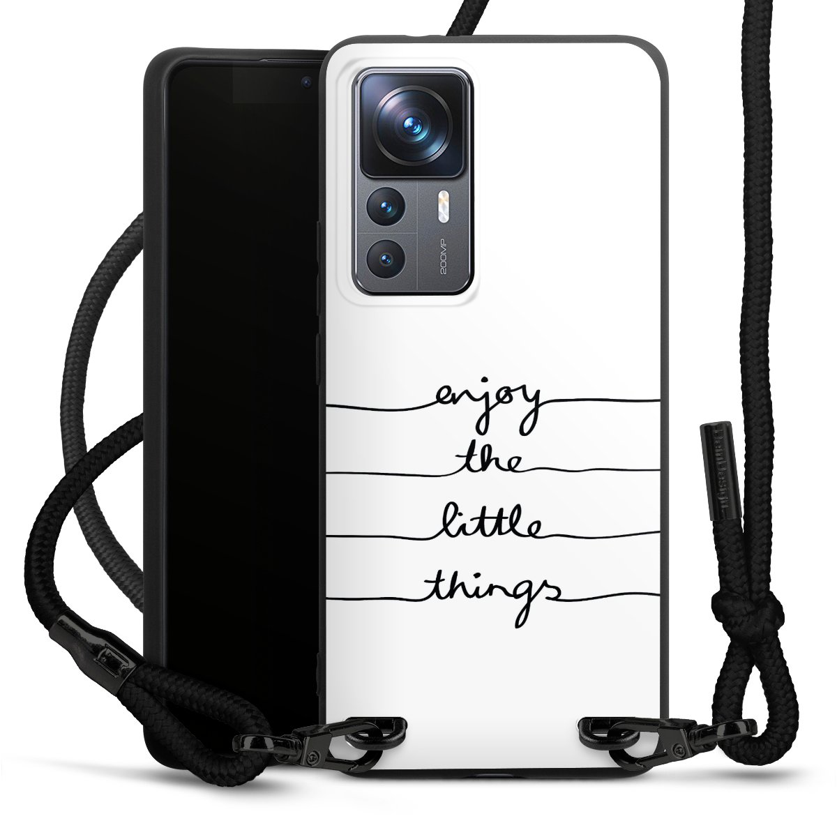 The matt black silicone case is made of flexible TPU (thermoplastic polyurethane) and offers robust protection. The durable, unbreakable material makes the cover flexible and dimensionally stable at the same time. The matte surface makes your design stand out more and is less susceptible to fingerprints and dirt. The stylish trend accessory fits comfortably in the hand and is perfectly complemented by the fabric (polyester) mobile phone strap. The braided fabric strap is approx. 1.70 metres long with a diameter of approx. 0.5 cm. Due to the special knotting technique, the length of the strap can be adjusted by simply pulling it, so that you can adapt it individually to your wishes. The practical case to wear around your neck is available with the fabric strap in black. As a little icing on the cake, we have provided the strap with a chic metal fastener in matt black. The strap is securely fastened to the case with loops made of high-quality genuine leather and press studs. The ends of the fabric strap are covered with metallic end caps and thus protected from fraying.