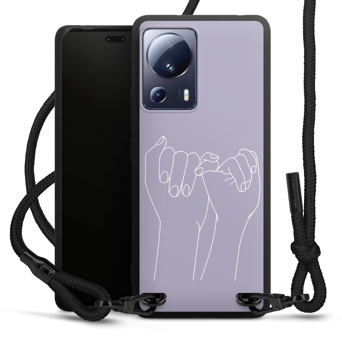 The matt black silicone case is made of flexible TPU (thermoplastic polyurethane) and offers robust protection. The durable, unbreakable material makes the cover flexible and dimensionally stable at the same time. The matte surface makes your design stand out more and is less susceptible to fingerprints and dirt. The stylish trend accessory fits comfortably in the hand and is perfectly complemented by the fabric (polyester) mobile phone strap. The braided fabric strap is approx. 1.70 metres long with a diameter of approx. 0.5 cm. Due to the special knotting technique, the length of the strap can be adjusted by simply pulling it, so that you can adapt it individually to your wishes. The practical case to wear around your neck is available with the fabric strap in black. As a little icing on the cake, we have provided the strap with a chic metal fastener in matt black. The strap is securely fastened to the case with loops made of high-quality genuine leather and press studs. The ends of the fabric strap are covered with metallic end caps and thus protected from fraying.