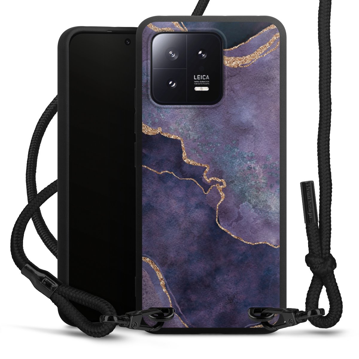 The matt black silicone case is made of flexible TPU (thermoplastic polyurethane) and offers robust protection. The durable, unbreakable material makes the cover flexible and dimensionally stable at the same time. The matte surface makes your design stand out more and is less susceptible to fingerprints and dirt. The stylish trend accessory fits comfortably in the hand and is perfectly complemented by the fabric (polyester) mobile phone strap. The braided fabric strap is approx. 1.70 metres long with a diameter of approx. 0.5 cm. Due to the special knotting technique, the length of the strap can be adjusted by simply pulling it, so that you can adapt it individually to your wishes. The practical case to wear around your neck is available with the fabric strap in black. As a little icing on the cake, we have provided the strap with a chic metal fastener in matt black. The strap is securely fastened to the case with loops made of high-quality genuine leather and press studs. The ends of the fabric strap are covered with metallic end caps and thus protected from fraying.