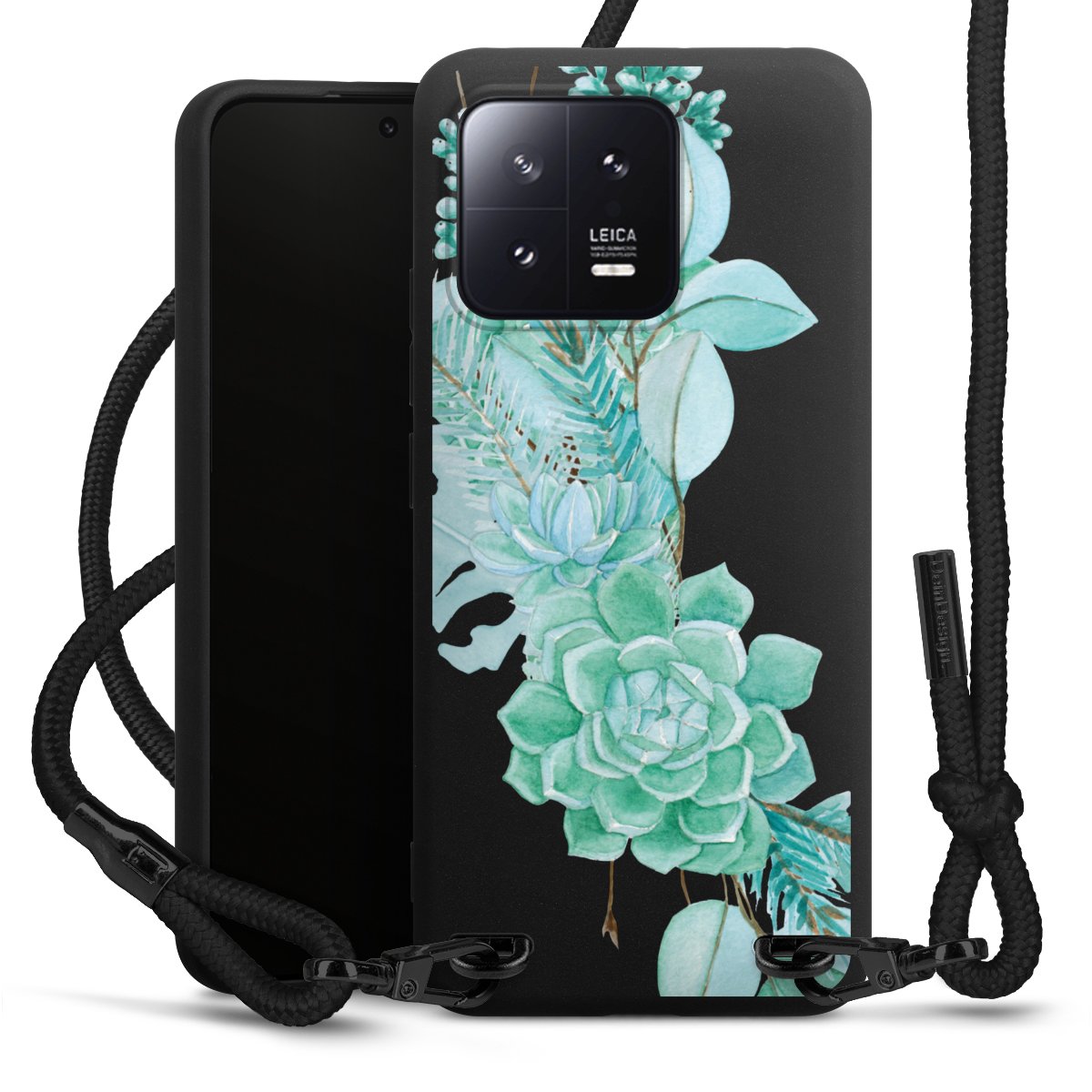 The matt black silicone case is made of flexible TPU (thermoplastic polyurethane) and offers robust protection. The durable, unbreakable material makes the cover flexible and dimensionally stable at the same time. The matte surface makes your design stand out more and is less susceptible to fingerprints and dirt. The stylish trend accessory fits comfortably in the hand and is perfectly complemented by the fabric (polyester) mobile phone strap. The braided fabric strap is approx. 1.70 metres long with a diameter of approx. 0.5 cm. Due to the special knotting technique, the length of the strap can be adjusted by simply pulling it, so that you can adapt it individually to your wishes. The practical case to wear around your neck is available with the fabric strap in black. As a little icing on the cake, we have provided the strap with a chic metal fastener in matt black. The strap is securely fastened to the case with loops made of high-quality genuine leather and press studs. The ends of the fabric strap are covered with metallic end caps and thus protected from fraying.