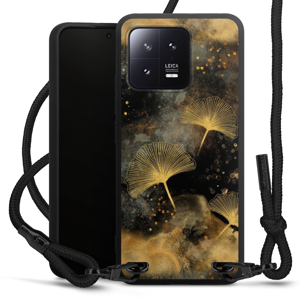 The matt black silicone case is made of flexible TPU (thermoplastic polyurethane) and offers robust protection. The durable, unbreakable material makes the cover flexible and dimensionally stable at the same time. The matte surface makes your design stand out more and is less susceptible to fingerprints and dirt. The stylish trend accessory fits comfortably in the hand and is perfectly complemented by the fabric (polyester) mobile phone strap. The braided fabric strap is approx. 1.70 metres long with a diameter of approx. 0.5 cm. Due to the special knotting technique, the length of the strap can be adjusted by simply pulling it, so that you can adapt it individually to your wishes. The practical case to wear around your neck is available with the fabric strap in black. As a little icing on the cake, we have provided the strap with a chic metal fastener in matt black. The strap is securely fastened to the case with loops made of high-quality genuine leather and press studs. The ends of the fabric strap are covered with metallic end caps and thus protected from fraying.