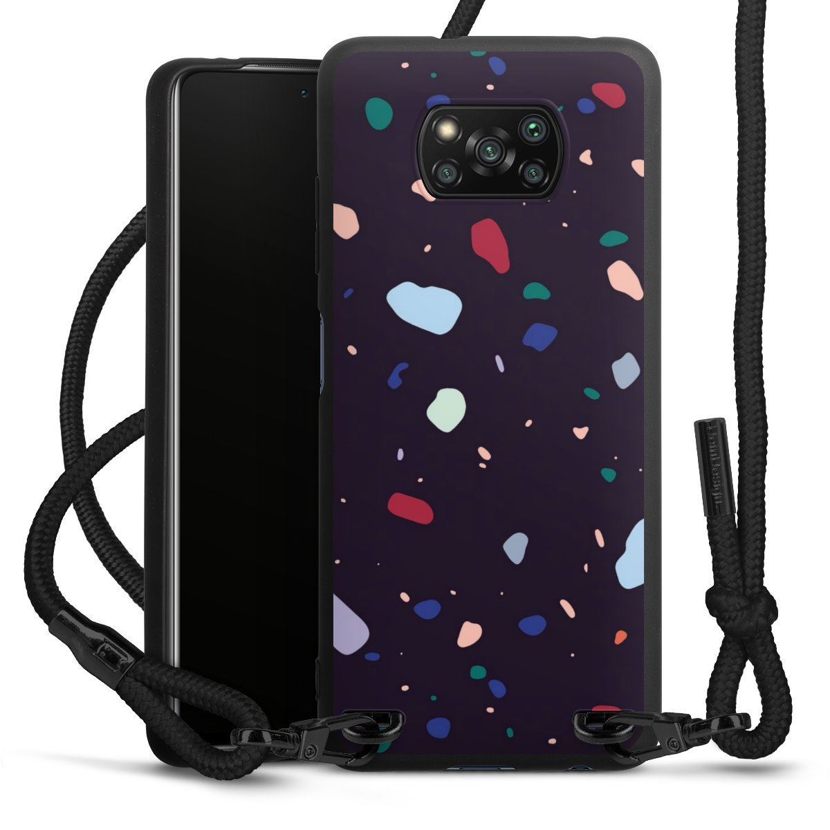 The matt black silicone case is made of flexible TPU (thermoplastic polyurethane) and offers robust protection. The durable, unbreakable material makes the cover flexible and dimensionally stable at the same time. The matte surface makes your design stand out more and is less susceptible to fingerprints and dirt. The stylish trend accessory fits comfortably in the hand and is perfectly complemented by the fabric (polyester) mobile phone strap. The braided fabric strap is approx. 1.70 metres long with a diameter of approx. 0.5 cm. Due to the special knotting technique, the length of the strap can be adjusted by simply pulling it, so that you can adapt it individually to your wishes. The practical case to wear around your neck is available with the fabric strap in black. As a little icing on the cake, we have provided the strap with a chic metal fastener in matt black. The strap is securely fastened to the case with loops made of high-quality genuine leather and press studs. The ends of the fabric strap are covered with metallic end caps and thus protected from fraying.