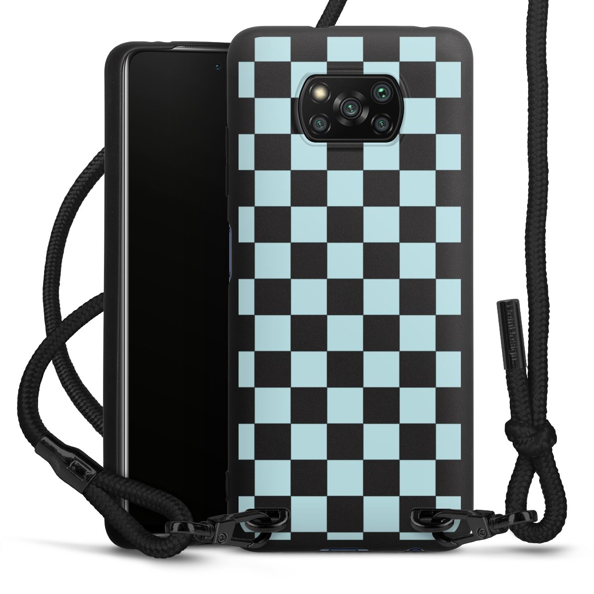 The matt black silicone case is made of flexible TPU (thermoplastic polyurethane) and offers robust protection. The durable, unbreakable material makes the cover flexible and dimensionally stable at the same time. The matte surface makes your design stand out more and is less susceptible to fingerprints and dirt. The stylish trend accessory fits comfortably in the hand and is perfectly complemented by the fabric (polyester) mobile phone strap. The braided fabric strap is approx. 1.70 metres long with a diameter of approx. 0.5 cm. Due to the special knotting technique, the length of the strap can be adjusted by simply pulling it, so that you can adapt it individually to your wishes. The practical case to wear around your neck is available with the fabric strap in black. As a little icing on the cake, we have provided the strap with a chic metal fastener in matt black. The strap is securely fastened to the case with loops made of high-quality genuine leather and press studs. The ends of the fabric strap are covered with metallic end caps and thus protected from fraying.