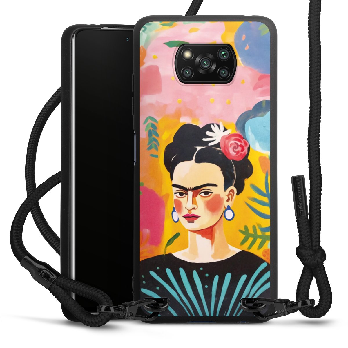 The matt black silicone case is made of flexible TPU (thermoplastic polyurethane) and offers robust protection. The durable, unbreakable material makes the cover flexible and dimensionally stable at the same time. The matte surface makes your design stand out more and is less susceptible to fingerprints and dirt. The stylish trend accessory fits comfortably in the hand and is perfectly complemented by the fabric (polyester) mobile phone strap. The braided fabric strap is approx. 1.70 metres long with a diameter of approx. 0.5 cm. Due to the special knotting technique, the length of the strap can be adjusted by simply pulling it, so that you can adapt it individually to your wishes. The practical case to wear around your neck is available with the fabric strap in black. As a little icing on the cake, we have provided the strap with a chic metal fastener in matt black. The strap is securely fastened to the case with loops made of high-quality genuine leather and press studs. The ends of the fabric strap are covered with metallic end caps and thus protected from fraying.