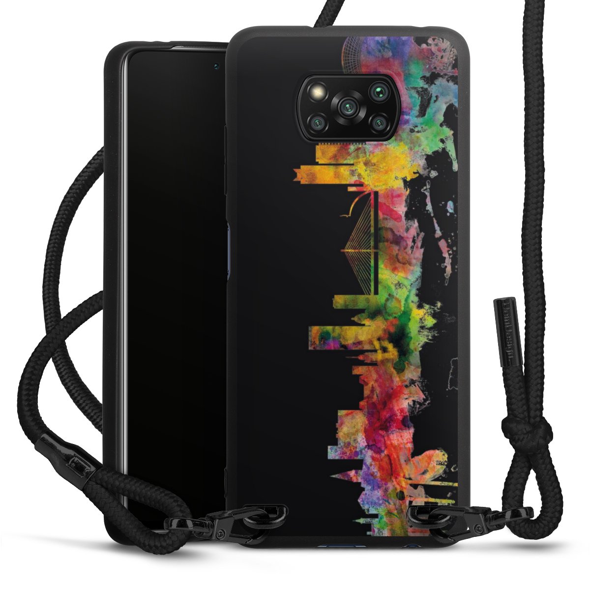 We use the solid direct print process for this phone case, which is why the print area only covers the back and the edge remains unprinted. The case to wear around your neck can be ordered unprinted, fully printed, or partially printed. For your design, either choose one of our exclusive shop motifs or get creative and create your own design, for example with photos and overlays. Design your own personal trend accessory and make an individual statement on the streets!