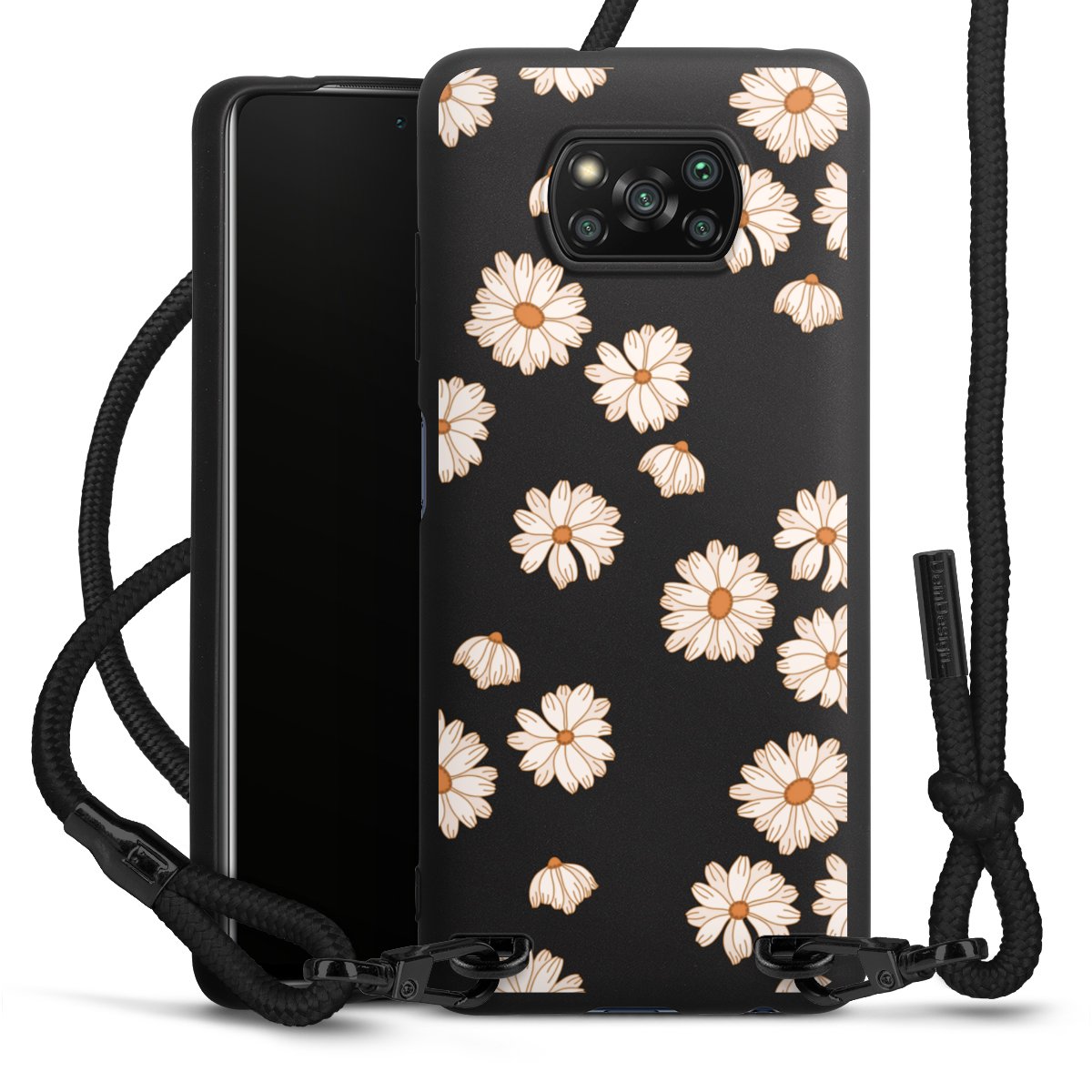 The matt black silicone case is made of flexible TPU (thermoplastic polyurethane) and offers robust protection. The durable, unbreakable material makes the cover flexible and dimensionally stable at the same time. The matte surface makes your design stand out more and is less susceptible to fingerprints and dirt. The stylish trend accessory fits comfortably in the hand and is perfectly complemented by the fabric (polyester) mobile phone strap. The braided fabric strap is approx. 1.70 metres long with a diameter of approx. 0.5 cm. Due to the special knotting technique, the length of the strap can be adjusted by simply pulling it, so that you can adapt it individually to your wishes. The practical case to wear around your neck is available with the fabric strap in black. As a little icing on the cake, we have provided the strap with a chic metal fastener in matt black. The strap is securely fastened to the case with loops made of high-quality genuine leather and press studs. The ends of the fabric strap are covered with metallic end caps and thus protected from fraying.