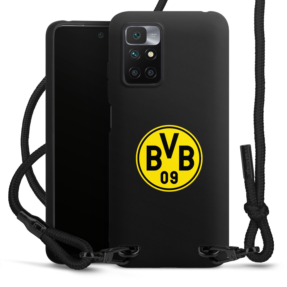 The matt black silicone case is made of flexible TPU (thermoplastic polyurethane) and offers robust protection. The durable, unbreakable material makes the cover flexible and dimensionally stable at the same time. The matte surface makes your design stand out more and is less susceptible to fingerprints and dirt. The stylish trend accessory fits comfortably in the hand and is perfectly complemented by the fabric (polyester) mobile phone strap. The braided fabric strap is approx. 1.70 metres long with a diameter of approx. 0.5 cm. Due to the special knotting technique, the length of the strap can be adjusted by simply pulling it, so that you can adapt it individually to your wishes. The practical case to wear around your neck is available with the fabric strap in black. As a little icing on the cake, we have provided the strap with a chic metal fastener in matt black. The strap is securely fastened to the case with loops made of high-quality genuine leather and press studs. The ends of the fabric strap are covered with metallic end caps and thus protected from fraying.