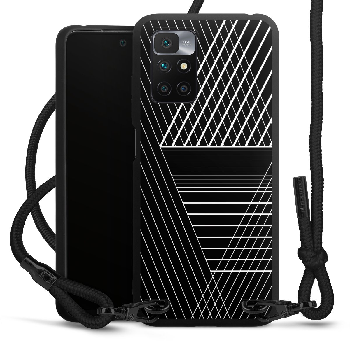 The matt black silicone case is made of flexible TPU (thermoplastic polyurethane) and offers robust protection. The durable, unbreakable material makes the cover flexible and dimensionally stable at the same time. The matte surface makes your design stand out more and is less susceptible to fingerprints and dirt. The stylish trend accessory fits comfortably in the hand and is perfectly complemented by the fabric (polyester) mobile phone strap. The braided fabric strap is approx. 1.70 metres long with a diameter of approx. 0.5 cm. Due to the special knotting technique, the length of the strap can be adjusted by simply pulling it, so that you can adapt it individually to your wishes. The practical case to wear around your neck is available with the fabric strap in black. As a little icing on the cake, we have provided the strap with a chic metal fastener in matt black. The strap is securely fastened to the case with loops made of high-quality genuine leather and press studs. The ends of the fabric strap are covered with metallic end caps and thus protected from fraying.