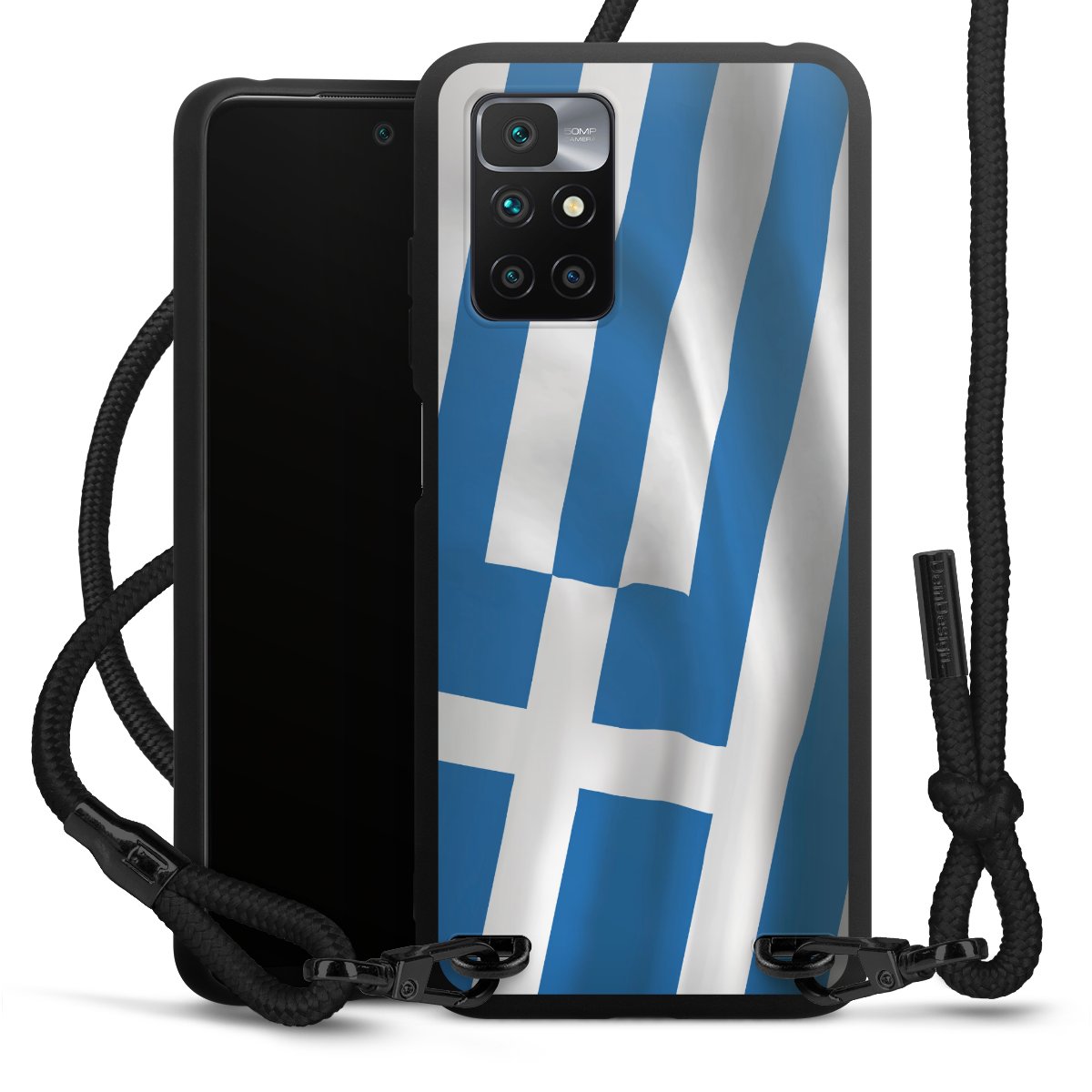 The matt black silicone case is made of flexible TPU (thermoplastic polyurethane) and offers robust protection. The durable, unbreakable material makes the cover flexible and dimensionally stable at the same time. The matte surface makes your design stand out more and is less susceptible to fingerprints and dirt. The stylish trend accessory fits comfortably in the hand and is perfectly complemented by the fabric (polyester) mobile phone strap. The braided fabric strap is approx. 1.70 metres long with a diameter of approx. 0.5 cm. Due to the special knotting technique, the length of the strap can be adjusted by simply pulling it, so that you can adapt it individually to your wishes. The practical case to wear around your neck is available with the fabric strap in black. As a little icing on the cake, we have provided the strap with a chic metal fastener in matt black. The strap is securely fastened to the case with loops made of high-quality genuine leather and press studs. The ends of the fabric strap are covered with metallic end caps and thus protected from fraying.