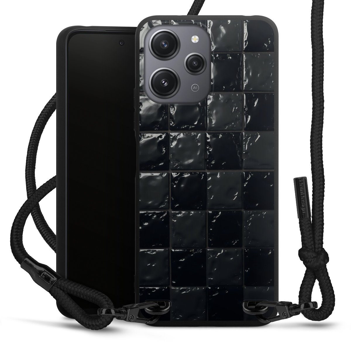 The matt black silicone case is made of flexible TPU (thermoplastic polyurethane) and offers robust protection. The durable, unbreakable material makes the cover flexible and dimensionally stable at the same time. The matte surface makes your design stand out more and is less susceptible to fingerprints and dirt. The stylish trend accessory fits comfortably in the hand and is perfectly complemented by the fabric (polyester) mobile phone strap. The braided fabric strap is approx. 1.70 metres long with a diameter of approx. 0.5 cm. Due to the special knotting technique, the length of the strap can be adjusted by simply pulling it, so that you can adapt it individually to your wishes. The practical case to wear around your neck is available with the fabric strap in black. As a little icing on the cake, we have provided the strap with a chic metal fastener in matt black. The strap is securely fastened to the case with loops made of high-quality genuine leather and press studs. The ends of the fabric strap are covered with metallic end caps and thus protected from fraying.