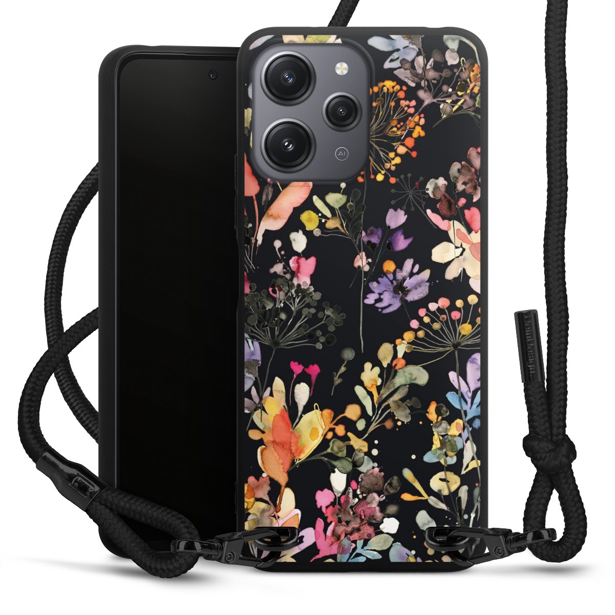 The matt black silicone case is made of flexible TPU (thermoplastic polyurethane) and offers robust protection. The durable, unbreakable material makes the cover flexible and dimensionally stable at the same time. The matte surface makes your design stand out more and is less susceptible to fingerprints and dirt. The stylish trend accessory fits comfortably in the hand and is perfectly complemented by the fabric (polyester) mobile phone strap. The braided fabric strap is approx. 1.70 metres long with a diameter of approx. 0.5 cm. Due to the special knotting technique, the length of the strap can be adjusted by simply pulling it, so that you can adapt it individually to your wishes. The practical case to wear around your neck is available with the fabric strap in black. As a little icing on the cake, we have provided the strap with a chic metal fastener in matt black. The strap is securely fastened to the case with loops made of high-quality genuine leather and press studs. The ends of the fabric strap are covered with metallic end caps and thus protected from fraying.