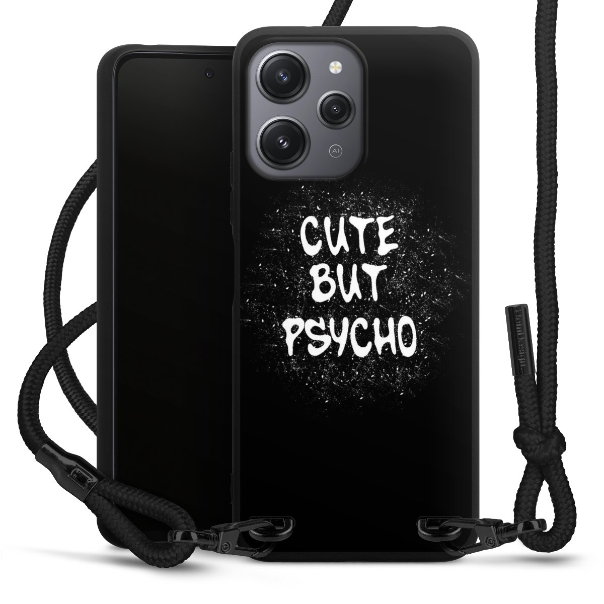 The matt black silicone case is made of flexible TPU (thermoplastic polyurethane) and offers robust protection. The durable, unbreakable material makes the cover flexible and dimensionally stable at the same time. The matte surface makes your design stand out more and is less susceptible to fingerprints and dirt. The stylish trend accessory fits comfortably in the hand and is perfectly complemented by the fabric (polyester) mobile phone strap. The braided fabric strap is approx. 1.70 metres long with a diameter of approx. 0.5 cm. Due to the special knotting technique, the length of the strap can be adjusted by simply pulling it, so that you can adapt it individually to your wishes. The practical case to wear around your neck is available with the fabric strap in black. As a little icing on the cake, we have provided the strap with a chic metal fastener in matt black. The strap is securely fastened to the case with loops made of high-quality genuine leather and press studs. The ends of the fabric strap are covered with metallic end caps and thus protected from fraying.