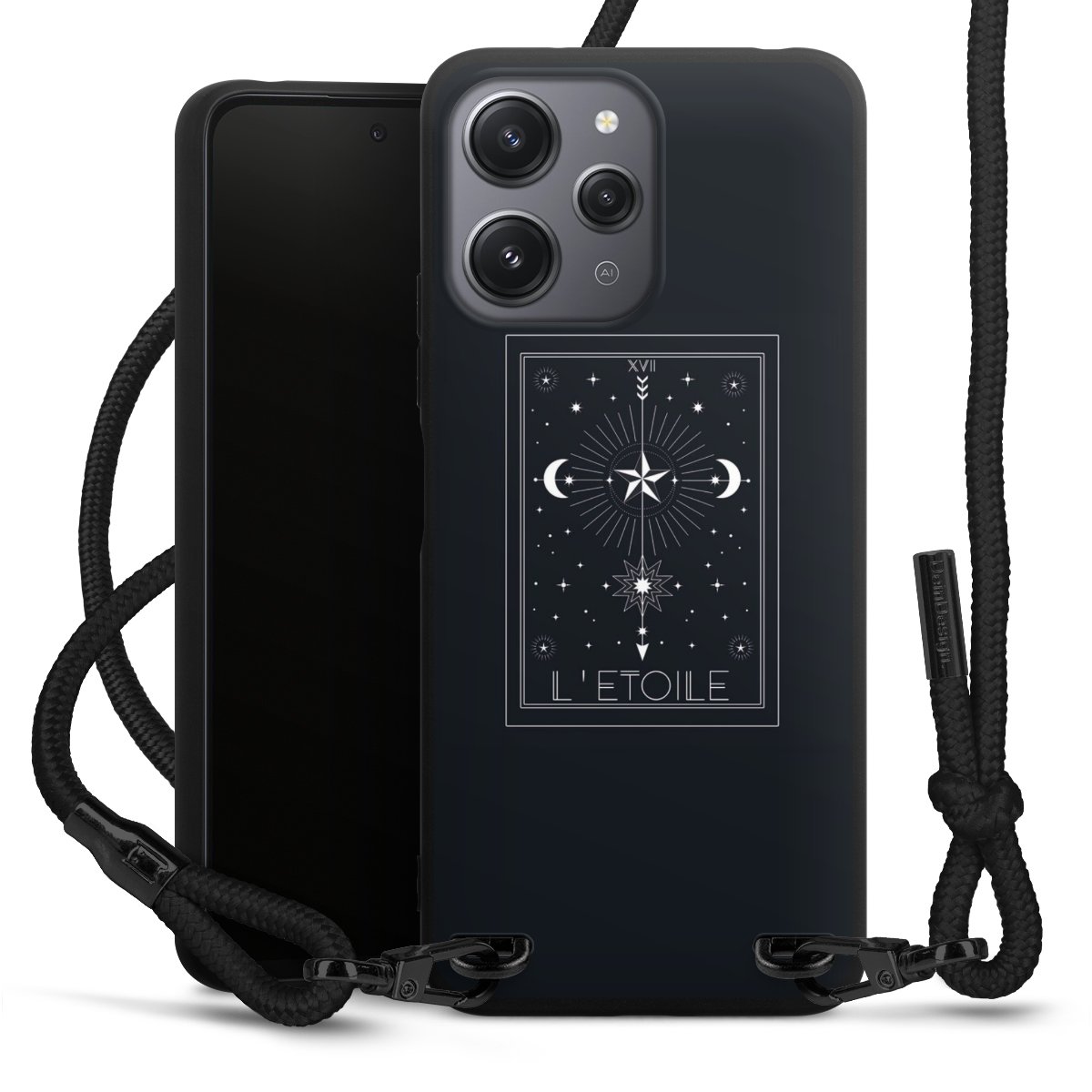 The matt black silicone case is made of flexible TPU (thermoplastic polyurethane) and offers robust protection. The durable, unbreakable material makes the cover flexible and dimensionally stable at the same time. The matte surface makes your design stand out more and is less susceptible to fingerprints and dirt. The stylish trend accessory fits comfortably in the hand and is perfectly complemented by the fabric (polyester) mobile phone strap. The braided fabric strap is approx. 1.70 metres long with a diameter of approx. 0.5 cm. Due to the special knotting technique, the length of the strap can be adjusted by simply pulling it, so that you can adapt it individually to your wishes. The practical case to wear around your neck is available with the fabric strap in black. As a little icing on the cake, we have provided the strap with a chic metal fastener in matt black. The strap is securely fastened to the case with loops made of high-quality genuine leather and press studs. The ends of the fabric strap are covered with metallic end caps and thus protected from fraying.