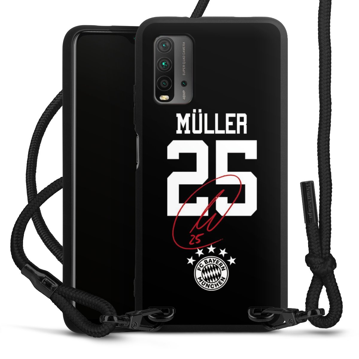 The matt black silicone case is made of flexible TPU (thermoplastic polyurethane) and offers robust protection. The durable, unbreakable material makes the cover flexible and dimensionally stable at the same time. The matte surface makes your design stand out more and is less susceptible to fingerprints and dirt. The stylish trend accessory fits comfortably in the hand and is perfectly complemented by the fabric (polyester) mobile phone strap. The braided fabric strap is approx. 1.70 metres long with a diameter of approx. 0.5 cm. Due to the special knotting technique, the length of the strap can be adjusted by simply pulling it, so that you can adapt it individually to your wishes. The practical case to wear around your neck is available with the fabric strap in black. As a little icing on the cake, we have provided the strap with a chic metal fastener in matt black. The strap is securely fastened to the case with loops made of high-quality genuine leather and press studs. The ends of the fabric strap are covered with metallic end caps and thus protected from fraying.