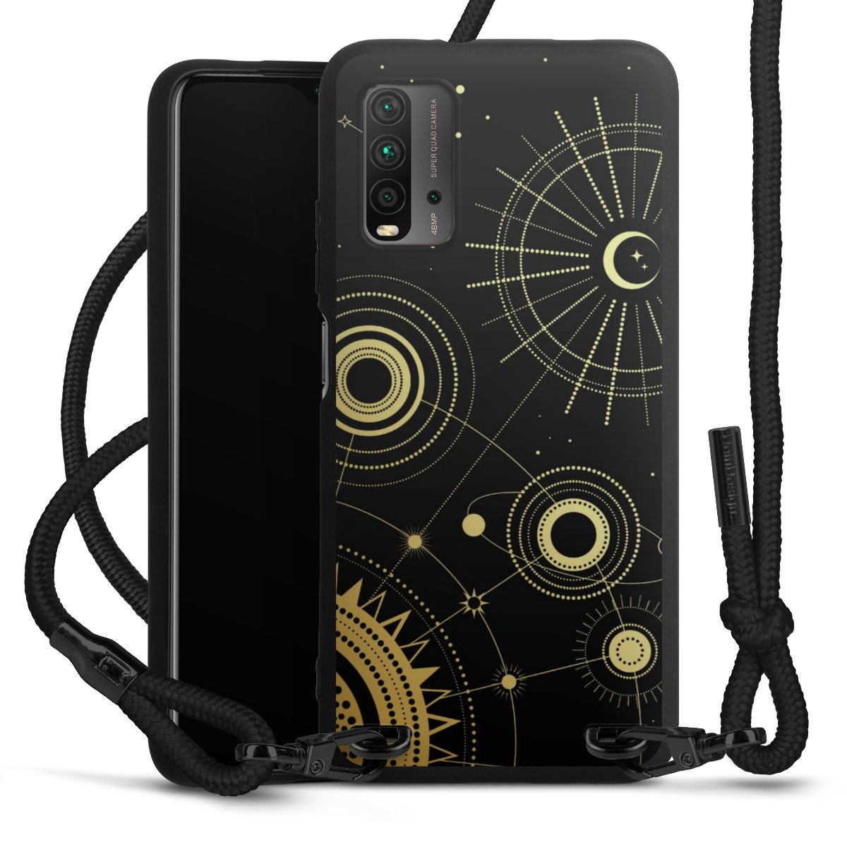 The matt black silicone case is made of flexible TPU (thermoplastic polyurethane) and offers robust protection. The durable, unbreakable material makes the cover flexible and dimensionally stable at the same time. The matte surface makes your design stand out more and is less susceptible to fingerprints and dirt. The stylish trend accessory fits comfortably in the hand and is perfectly complemented by the fabric (polyester) mobile phone strap. The braided fabric strap is approx. 1.70 metres long with a diameter of approx. 0.5 cm. Due to the special knotting technique, the length of the strap can be adjusted by simply pulling it, so that you can adapt it individually to your wishes. The practical case to wear around your neck is available with the fabric strap in black. As a little icing on the cake, we have provided the strap with a chic metal fastener in matt black. The strap is securely fastened to the case with loops made of high-quality genuine leather and press studs. The ends of the fabric strap are covered with metallic end caps and thus protected from fraying.