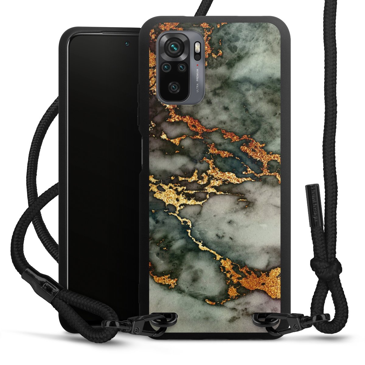 The matt black silicone case is made of flexible TPU (thermoplastic polyurethane) and offers robust protection. The durable, unbreakable material makes the cover flexible and dimensionally stable at the same time. The matte surface makes your design stand out more and is less susceptible to fingerprints and dirt. The stylish trend accessory fits comfortably in the hand and is perfectly complemented by the fabric (polyester) mobile phone strap. The braided fabric strap is approx. 1.70 metres long with a diameter of approx. 0.5 cm. Due to the special knotting technique, the length of the strap can be adjusted by simply pulling it, so that you can adapt it individually to your wishes. The practical case to wear around your neck is available with the fabric strap in black. As a little icing on the cake, we have provided the strap with a chic metal fastener in matt black. The strap is securely fastened to the case with loops made of high-quality genuine leather and press studs. The ends of the fabric strap are covered with metallic end caps and thus protected from fraying.