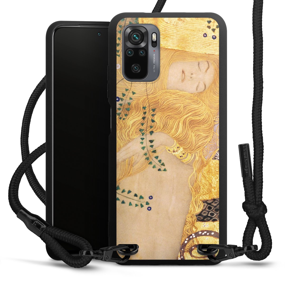 The matt black silicone case is made of flexible TPU (thermoplastic polyurethane) and offers robust protection. The durable, unbreakable material makes the cover flexible and dimensionally stable at the same time. The matte surface makes your design stand out more and is less susceptible to fingerprints and dirt. The stylish trend accessory fits comfortably in the hand and is perfectly complemented by the fabric (polyester) mobile phone strap. The braided fabric strap is approx. 1.70 metres long with a diameter of approx. 0.5 cm. Due to the special knotting technique, the length of the strap can be adjusted by simply pulling it, so that you can adapt it individually to your wishes. The practical case to wear around your neck is available with the fabric strap in black. As a little icing on the cake, we have provided the strap with a chic metal fastener in matt black. The strap is securely fastened to the case with loops made of high-quality genuine leather and press studs. The ends of the fabric strap are covered with metallic end caps and thus protected from fraying.