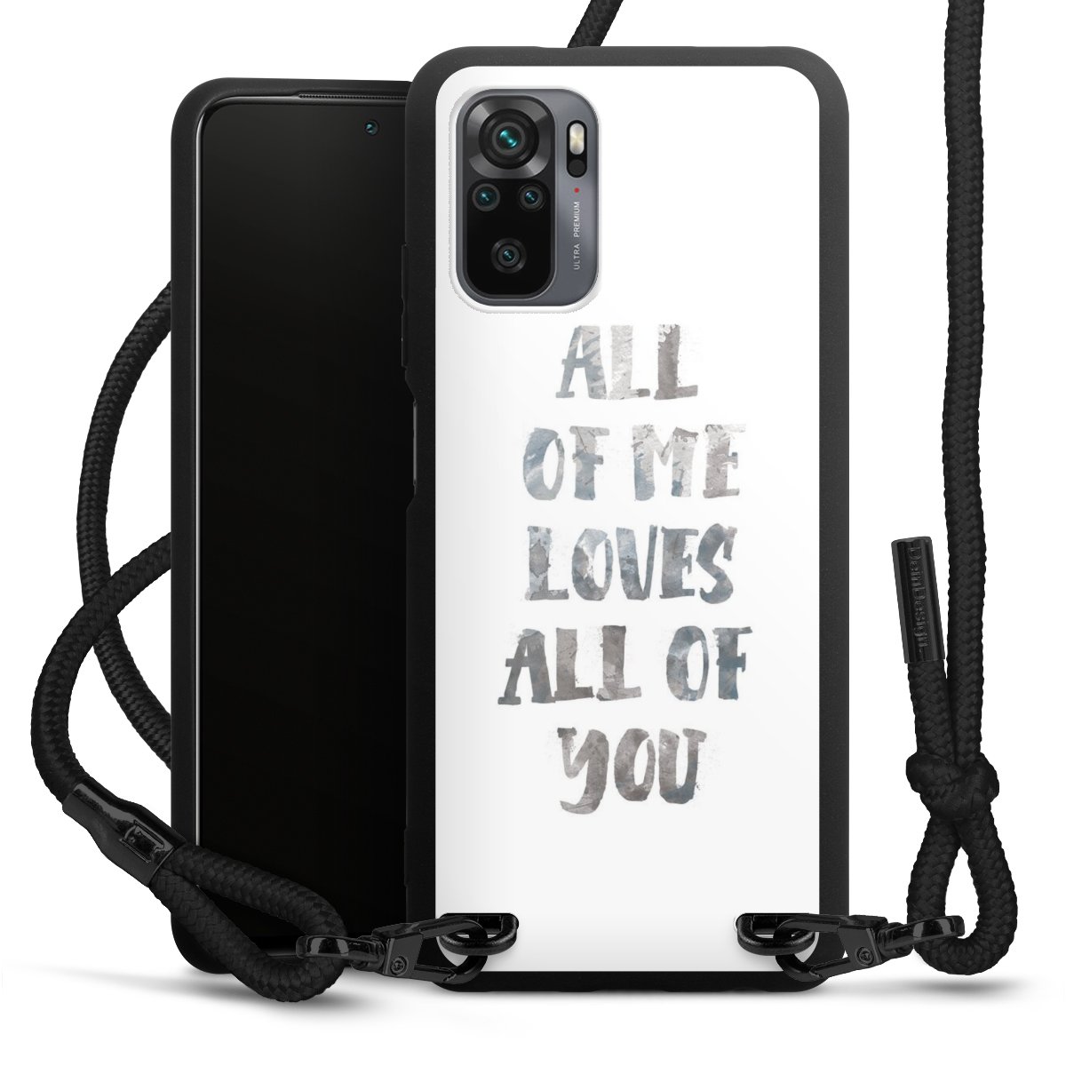 The matt black silicone case is made of flexible TPU (thermoplastic polyurethane) and offers robust protection. The durable, unbreakable material makes the cover flexible and dimensionally stable at the same time. The matte surface makes your design stand out more and is less susceptible to fingerprints and dirt. The stylish trend accessory fits comfortably in the hand and is perfectly complemented by the fabric (polyester) mobile phone strap. The braided fabric strap is approx. 1.70 metres long with a diameter of approx. 0.5 cm. Due to the special knotting technique, the length of the strap can be adjusted by simply pulling it, so that you can adapt it individually to your wishes. The practical case to wear around your neck is available with the fabric strap in black. As a little icing on the cake, we have provided the strap with a chic metal fastener in matt black. The strap is securely fastened to the case with loops made of high-quality genuine leather and press studs. The ends of the fabric strap are covered with metallic end caps and thus protected from fraying.