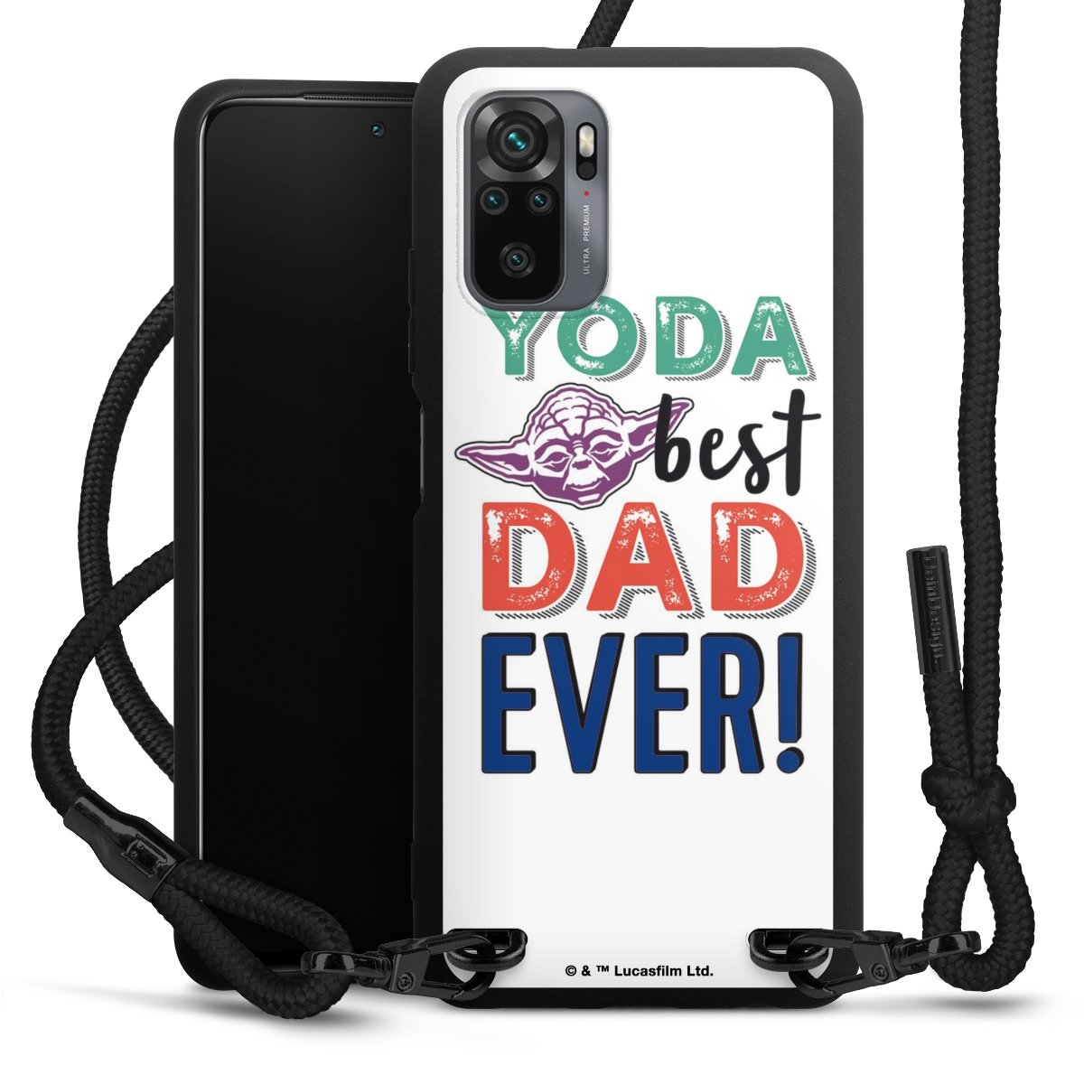 The matt black silicone case is made of flexible TPU (thermoplastic polyurethane) and offers robust protection. The durable, unbreakable material makes the cover flexible and dimensionally stable at the same time. The matte surface makes your design stand out more and is less susceptible to fingerprints and dirt. The stylish trend accessory fits comfortably in the hand and is perfectly complemented by the fabric (polyester) mobile phone strap. The braided fabric strap is approx. 1.70 metres long with a diameter of approx. 0.5 cm. Due to the special knotting technique, the length of the strap can be adjusted by simply pulling it, so that you can adapt it individually to your wishes. The practical case to wear around your neck is available with the fabric strap in black. As a little icing on the cake, we have provided the strap with a chic metal fastener in matt black. The strap is securely fastened to the case with loops made of high-quality genuine leather and press studs. The ends of the fabric strap are covered with metallic end caps and thus protected from fraying.